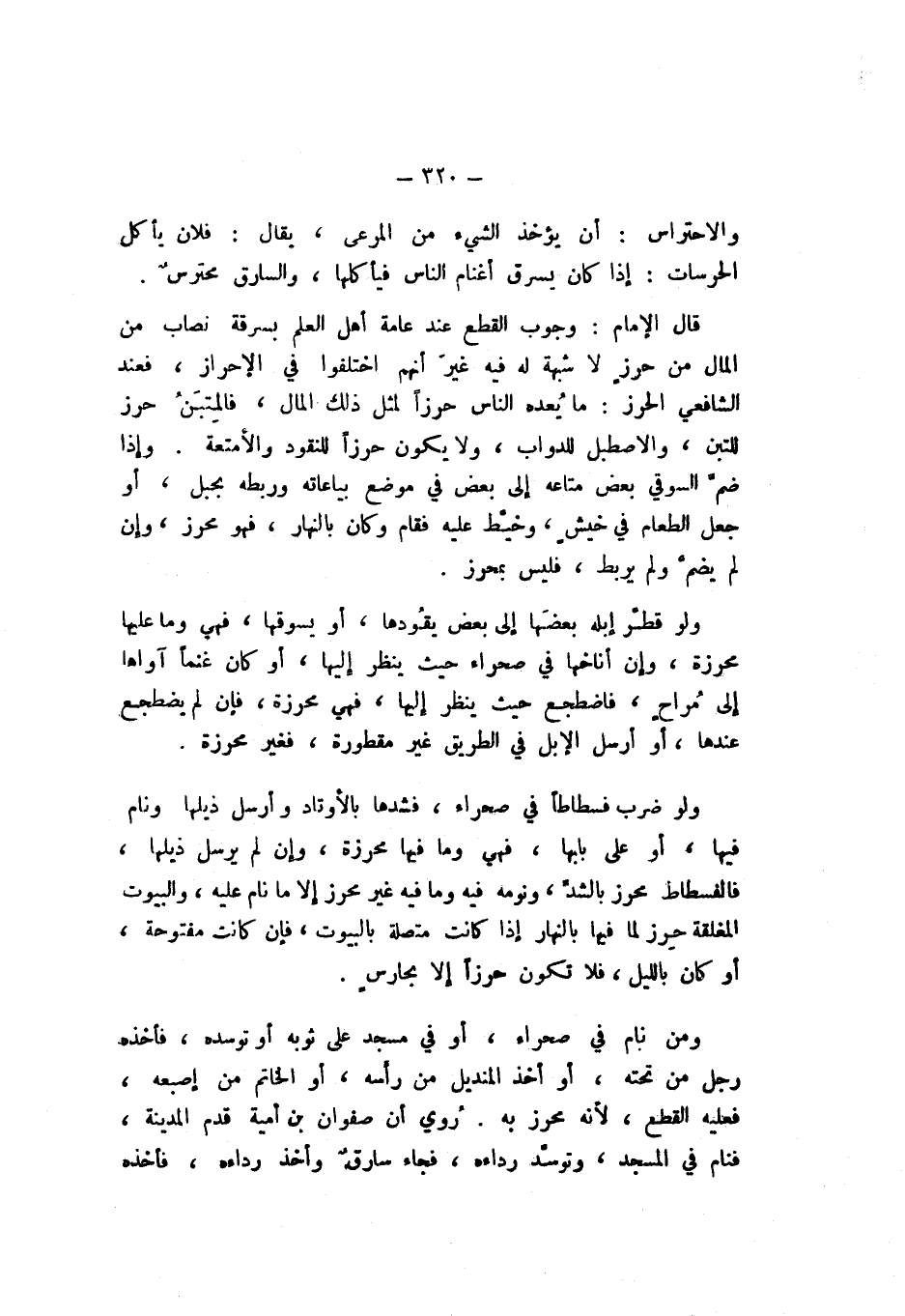 قَالَ الإِمَامُ: وُجُوبُ الْقَطْعِ عِنْدَ عَامَّةِ أَهْلِ الْعِلْمِ بِسِرْقَةِ نِصَابٍ مِنَ الْمَالِ مِنْ حِرْزٍ لَا شُبْهَةَ لَهُ فِيهِ، غَيْرَ أَنَّهُمُ اخْتَلَفُوا فِي الإِحْرَازِ، فَعِنْدَ الشَّافِعِيِّ الْحِرْزُ: مَا يُعِدُّهُ النَّاسُ حِرْزًا لِمِثْلِ ذَلِكَ الْمَالِ، فَالْمِتْبَنُ حَرِزٌ لِلتِّبْنِ، وَالاصْطَبْلُ لِلدَّوَابِّ، وَلا يَكُونُ حِرْزًا لِلنُّقُودِ، وَالأَمْتِعَةِ.