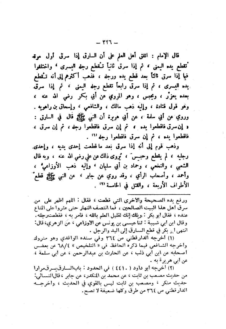 قَالَ الإِمَامُ: اتَّفَقَ أَهْلُ الْعِلْمِ عَلَى أَنَّ السَّارِقَ إِذَا سَرَقَ أَوَّلَ مَرَّةٍ تُقْطَعُ يَدُهُ الْيُمْنَى، ثُمَّ إِذَا سَرَقَ ثَانِيًا تُقْطَعُ رِجْلُهُ الْيُسْرَى، وَاخْتَلَفُوا فِيمَا إِذَا سَرَقَ ثَالِثًا، بَعْدَ قَطْعِ يَدِهِ وَرِجْلِهِ، فَذَهَبَ أَكْثَرُهُمْ إِلَى أَنَّهُ تُقْطَعُ يَدُهُ الْيُسْرَى، ثُمَّ إِذَا سَرَقَ رَابِعًا تُقْطَعُ رِجْلُهُ الْيُمْنَى، ثُمَّ إِذَا سَرَقَ بَعْدَهُ يُعَزَّرُ، وَيُحْبَسُ، وَهُوَ الْمَرْوِيُّ عَنْ أَبِي بَكْرٍ رَضِيَ اللَّهُ عَنْهُ، هُوَ قَوْلُ قَتَادَةَ، وَإِلَيْهِ ذَهَبَ مَالِكٌ، وَالشَّافِعِيُّ، وَإِسْحَاقُ بْنُ رَاهَوَيْهِ.