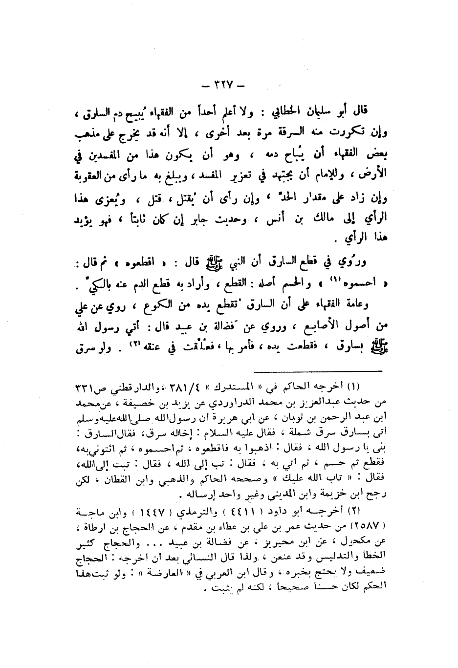 قَالَ أَبُو سُلَيْمَانَ الْخَطَّابِيُّ: وَلا أَعْلَمُ أَحَدًا مِنَ الْفُقَهَاءِ يُبِيحُ دَمَ السَّارِقِ، وَإِنْ تَكَرَّرَتْ مِنْهُ السَّرِقَةُ مَرَّةً بَعْدَ أُخْرَى، إِلا أَنَّهُ قَدْ يَخْرُجُ عَلَى مَذْهَبِ بَعْضِ الْفُقَهَاءِ أَنْ يُبَاحَ دَمُهُ، وَهُوَ أَنْ يَكُونَ هَذَا مِنَ الْمُفْسِدِينَ فِي الأَرْضِ، وَلِلإِمَامِ أَنْ يَجْتَهِدَ فِي تَعْزِيرِ الْمُفْسِدِ، وَيَبْلُغَ بِهِ مَا رَأَى مِنَ الْعُقُوبَةِ، وَإِنْ زَادَ عَلَى مِقْدَارِ الْحَدِّ، وَإِنْ رَأَى أَنْ يُقْتَلُ قُتِلَ، وَيُعْزَى هَذَا الرَّأْيُ إِلَى مَالِكِ بْنِ أَنَسٍ، وَحَدِيثِ جَابِرٍ إِنْ كَانَ ثَابِتًا، فَهُوَ يُؤَيِّدُ هَذَا الرَّأْيَ.
