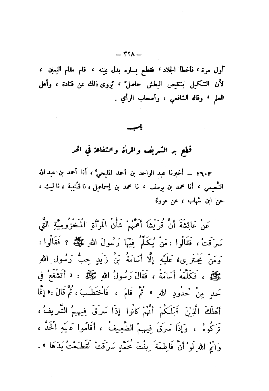 2603 - أَخْبَرَنَا عَبْدُ الْوَاحِدِ بْنُ أَحْمدَ الْمَلِيحِيُّ، أَنا أَحْمَدُ بْنُ عَبْدِ اللَّهِ النُّعَيْمِيُّ، أَنا مُحَمَّدُ بْنُ يُوسُفَ، نَا مُحَمَّدُ بْنُ إِسْمَاعِيلَ، نَا قُتَيْبَةُ، نَا لَيْثٌ، عَنِ ابْنِ شِهَابٍ، عَنْ عُرْوَةَ، عَنْ عَائِشَةَ، أَنَّ قُرَيْشًا أَهَمَّهُمْ شَأْنُ الْمَرْأَةِ الْمَخْزُومِيَّةِ الَّتِي سَرَقَتْ، فَقَالُوا: مَنْ يُكَلِّمُ فِيهَا رَسُولَ اللَّهِ صَلَّى اللهُ عَلَيْهِ وَسَلَّمَ؟ فَقَالُوا: وَمَنْ يَجْتَرِئُ عَلَيْهِ إِلَّا أُسَامَةُ بْنُ زَيْدٍ حِبُّ رَسُولِ اللَّهِ صَلَّى اللهُ عَلَيْهِ وَسَلَّمَ، فَكَلَّمَهُ أُسَامَةُ، فَقَالَ رَسُولُ اللَّهِ صَلَّى اللهُ عَلَيْهِ وَسَلَّمَ: «أَتَشْفَعُ فِي حَدٍّ مِنْ حُدُودِ اللَّهِ»، ثُمَّ قَامَ، فَاخْتَطَبَ، ثُمَّ قَالَ: «إِنَّمَا أَهْلَكَ الَّذِينَ قَبْلَكُمْ أَنَّهُمْ كَانُوا إِذَا سَرَقَ فِيهِمُ الشَّرِيفُ، تَرَكُوهُ، وَإِذَا سَرَقَ فِيهِمُ الضَّعِيفُ، أَقَامُوا عَلَيْهِ الْحَدَّ، وَايْمُ اللَّهِ لَوْ أَنَّ فَاطِمَةَ بِنْتَ مُحَمَّدٍ سَرَقَتْ لَقَطَعْتُ يَدَهَا».
