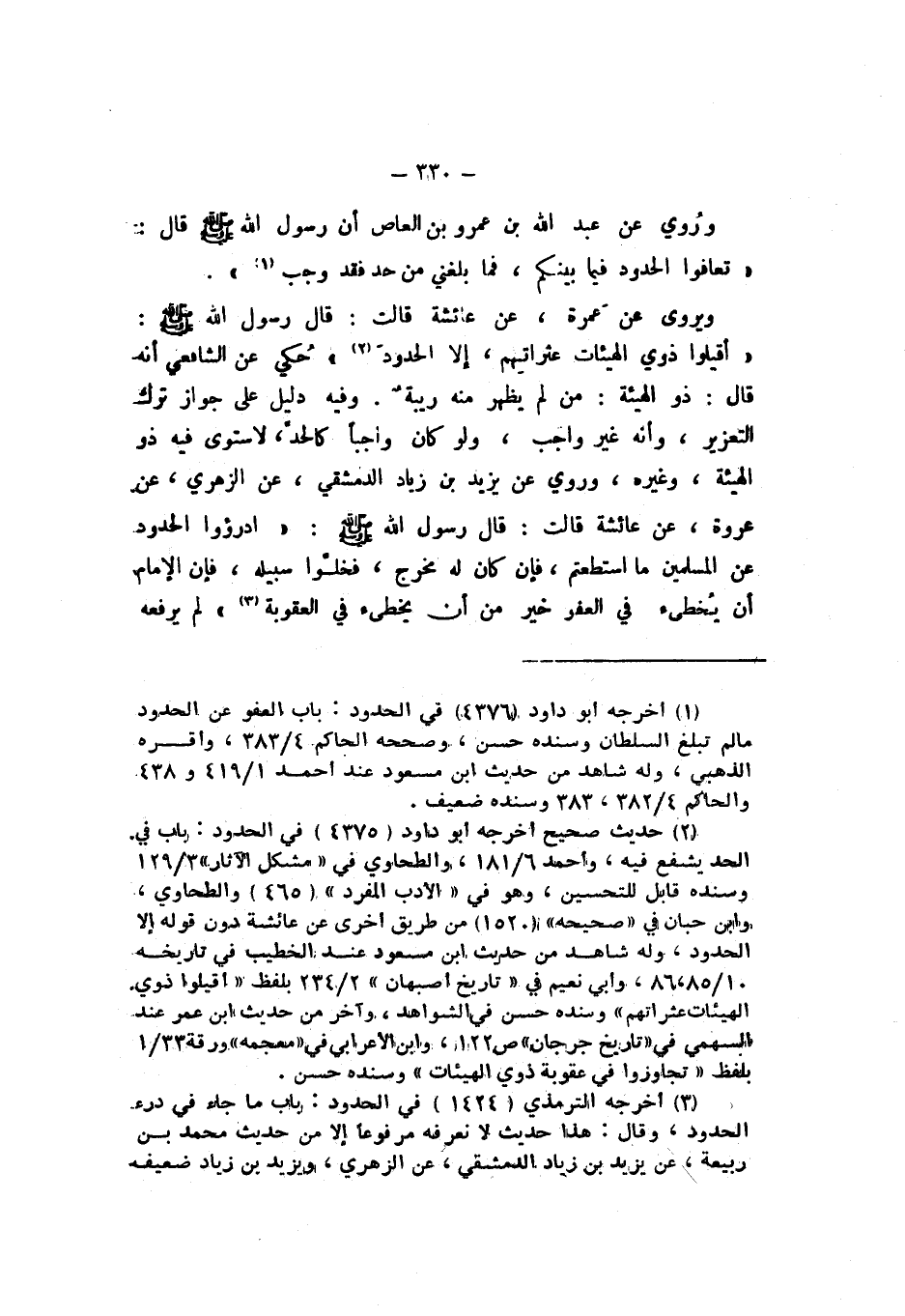 وَرُوِيَ عَنْ عَبْدِ اللَّهِ بْنِ عَمْرِو بْنِ الْعَاصِ، أَنَّ رَسُولَ اللَّهِ صَلَّى اللهُ عَلَيْهِ وَسَلَّمَ، قَالَ: «تَعَافَوُا الْحُدُودَ فِيمَا بَيْنَكُمْ، فَمَا بَلَغَنِي مِنْ حَدٍّ فَقَدْ وَجَبَ».