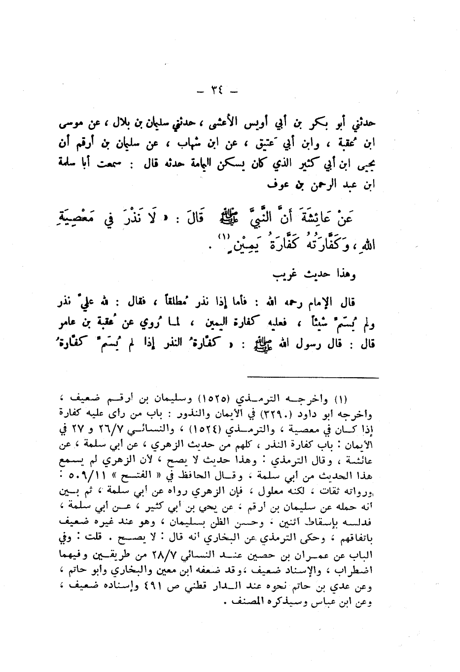 حَدَّثَنِي أَبُو بَكْرِ بْنُ أَبِي أُوَيْسٍ الأَعْشَى، حَدَّثَنِي سُلَيْمَانُ بْنُ بِلالٍ، عَنْ مُوسَى بْنِ عُقْبَةَ، وَابْنِ أَبِي عَتِيقٍ، عَنِ ابْنِ شِهَابٍ، عَنْ سُلَيْمَانَ بْنِ أَرْقَمَ، أَنَّ يَحْيَى بْنَ أَبِي كَثِيرٍ الَّذِي كَانَ يَسْكُنُ الْيَمَامَةَ حَدَّثَهُ، قَالَ: سَمِعْتُ أَبَا سَلَمَةَ بْنَ عَبْدِ الرَّحْمَنِ بْنِ عَوْفٍ، عَنْ عَائِشَةَ، أَنّ النَّبيَّ صَلَّى اللهُ عَلَيْهِ وَسَلَّمَ، قَالَ: «لَا نَذْرَ فِي مَعْصِيَةِ اللَّهِ، وَكَفَّارَتُهُ كَفَّارةُ يَمِينٍ».