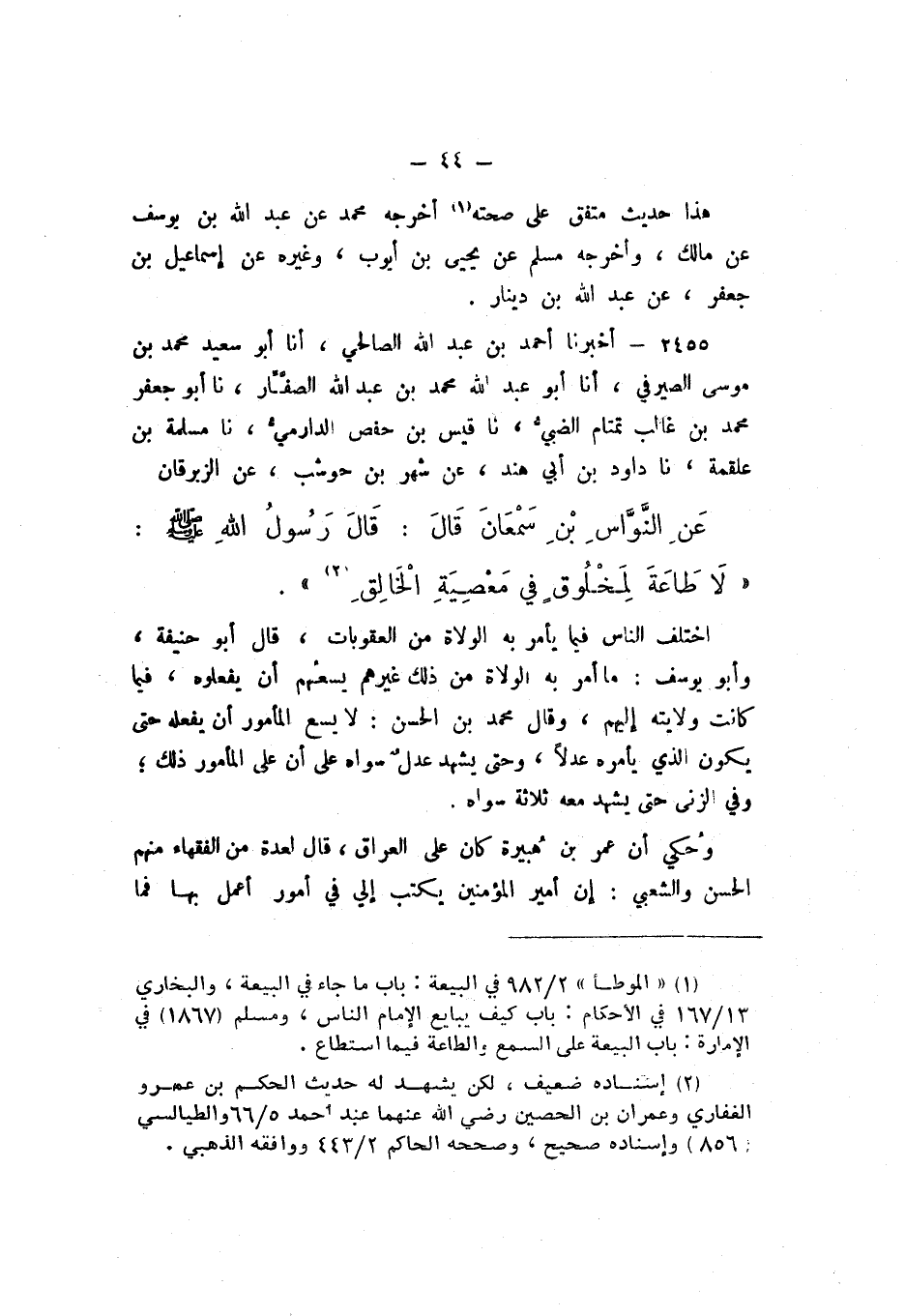 2455 - أَخْبَرَنَا أَحْمَدُ بْنُ عَبْدِ اللَّهِ الصَّالِحِيُّ، أَنا أَبُو سَعِيدٍ مُحَمَّدُ بْنُ مُوسَى الصَّيْرَفِيُّ، أَنا أَبُو عَبْدِ اللَّهِ مُحَمَّدُ بْنُ عَبْدِ اللَّهِ الصَّفَّارُ، نَا أَبُو جَعْفَرٍ مُحَمَّدُ بْنُ غَالِبٍ تَمْتَامٌ الضَّبِّيُّ، نَا قَيْسُ بْنُ حَفْصٍ الدَّارِمِيُّ، نَا مَسْلَمَةُ بْنُ عَلْقَمَةَ، نَا دَاوُدُ بْنُ أَبِي هِنْدٍ، عَنْ شَهْرِ بْنِ حَوْشَبٍ، عَنِ الزِّبْرِقَانِ، عَنِ النَّوَّاسِ بنِ سَمْعَانَ، قَالَ: قَالَ رَسُولُ اللَّهِ صَلَّى اللهُ عَلَيْهِ وَسَلَّمَ: «لَا طَاعَةَ لِمَخْلُوقٍ فِي مَعْصِيةِ الخَالِقِ»