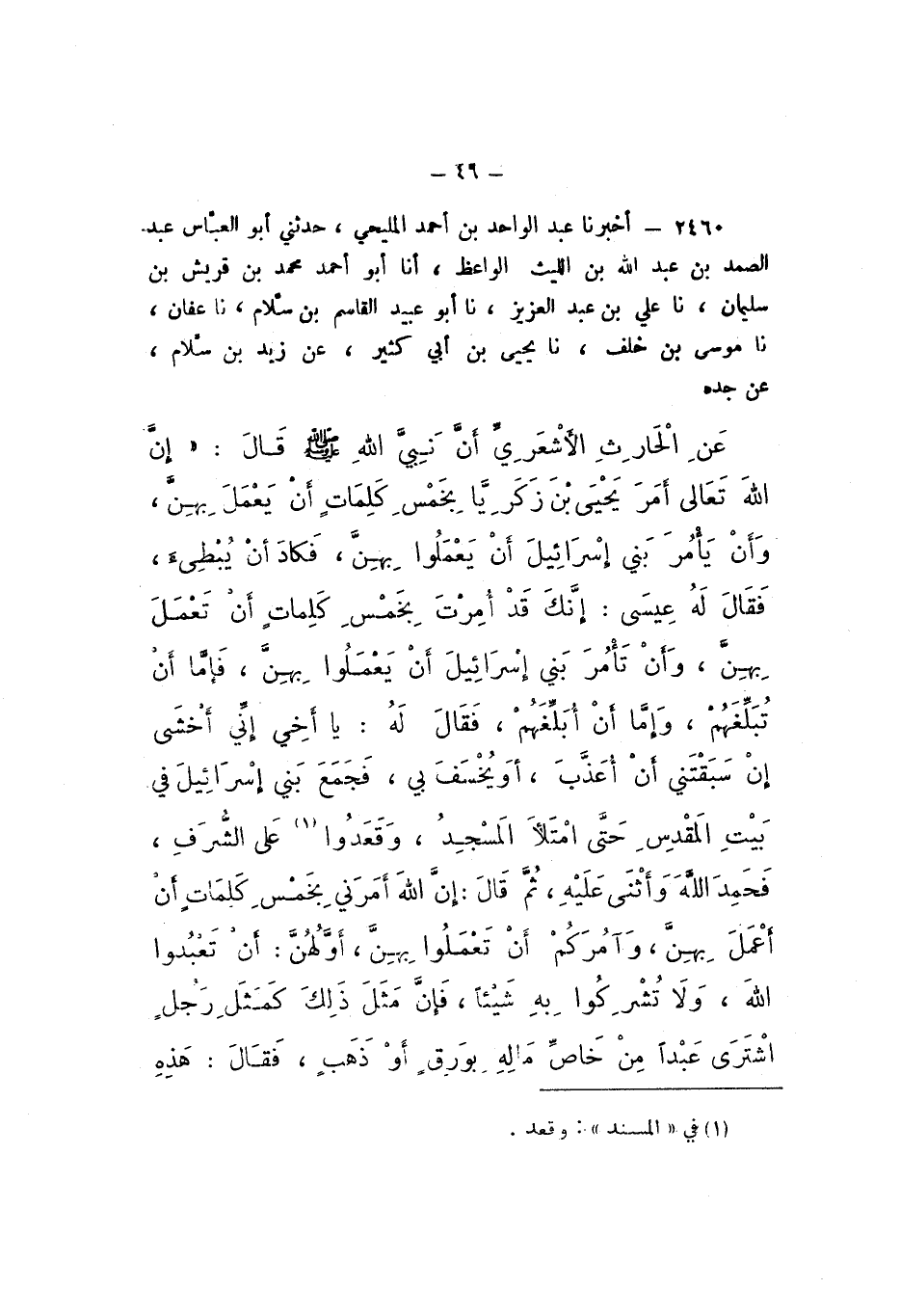 2460 - أَخْبَرَنَا عَبْدُ الْوَاحِدِ بْنُ أَحْمَدَ الْمَلِيحِيُّ، حَدَّثَنِي أَبُو الْعَبَّاسِ عَبْدُ الصَّمَدِ بْنُ عَبْدِ اللَّهِ بْنِ اللَّيْثِ الْوَاعِظُ، أَنا أَبُو أَحْمَدَ مُحَمَّدُ بْنُ قُرَيْشِ بْنِ سُلَيْمَانَ، نَا عَلِيُّ بْنُ عَبْدِ الْعَزِيزِ، نَا أَبُو عُبَيْدٍ الْقَاسِمُ بْنُ سَلامٍ، نَا عَفَّانُ، نَا مُوسَى بْنُ خَلَفٍ، نَا يَحْيَى بْنُ أَبِي كَثِيرٍ، عَنْ زَيْدِ بْنِ سَلامٍ، عَنْ جَدِّهِ، عَنِ الْحَارِثِ الأشْعَرِيِّ، أَنَّ نَبِيَّ اللَّهِ صَلَّى اللهُ عَلَيْهِ وَسَلَّمَ، قَالَ: " إنَّ اللَّهَ تَعَالَى أَمَرَ يَحْيَى بْنَ زَكَرِيَّا بِخَمْسِ كَلِماتٍ أَنْ يَعْمَلَ بِهِنَّ، وَأَنْ يَأْمُرَ بَنِي إِسْرَائِيلَ أَنْ يَعْمَلُوا بِهِنَّ، فَكَادَ أَنْ يُبْطِئَ، فَقَالَ لَهُ عِيسَى: إنَّكَ قَدْ أُمِرْتَ بِخَمْسِ كَلِمَاتٍ أَنْ تَعْمَلَ بِهِنَّ، وَأَنْ تَأْمُرَ بَنِي إِسْرَائِيلَ أَنْ يَعْمَلُوا بِهِنَّ، فَإِمَّا أَنْ تُبَلِّغَهُمْ، وَإِمَّا أَنْ أُبَلِّغَهُمْ، فَقَالَ لَهُ: يَا أَخِي، إِنِّي أَخْشَى إِنْ سَبَقْتَنِي أَنْ أُعَذَّبَ، أَوْ يُخْسَفَ بِي، فَجَمَعَ بَنِي إِسْرَائِيلَ فِي بَيْتِ الْمَقْدِسِ حَتَّى امْتَلأَ الْمَسْجِدُ، وَقَعَدُوا عَلَى الشُّرَفِ، فَحَمِدَ اللَّهَ وَأَثْنَى عَلَيْهِ، ثمَّ قَالَ: إنَّ اللَّهَ أَمَرَنِي بِخَمْسِ كَلِمَاتٍ أَنْ أَعْمَلَ بِهِنَّ، وَآمُرَكُمْ أَنْ تَعْمَلُوا بِهِنَّ، أَوَّلُهُنَّ: أَنْ تَعْبُدُوا اللَّهَ، وَلا تُشْرِكُوا بِهِ شَيْئًا، فَإِنَّ مَثَلَ ذَلِكَ كَمَثَلِ رَجُلٍ اشْتَرَى عَبْدًا مِن خَاصِّ مَالِهِ بِوَرِقٍ أَوْ ذَهَبٍ، فَقَالَ: هَذِهِ
