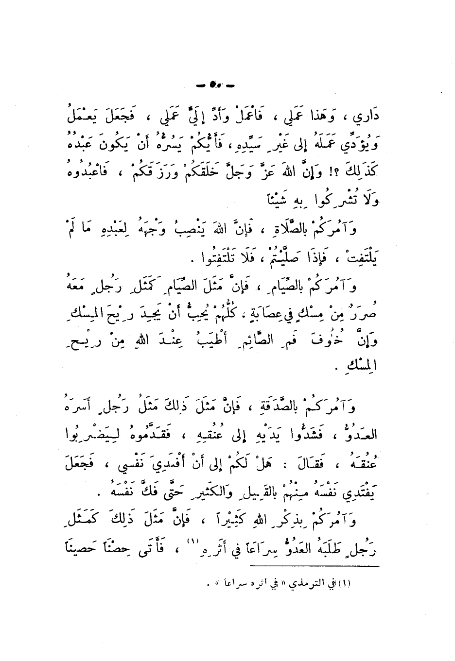 وَآمُرَكُمْ بِذِكْرِ اللَّهِ كَثِيرًا، فإنَّ مَثَلَ ذَلِكَ كَمَثَلِ رَجُلٍ طَلَبَهُ الْعَدُوَّ سِرَاعًا فِي أَثَرِهِ، فَأَتَى حِصْنًا حَصِينًا