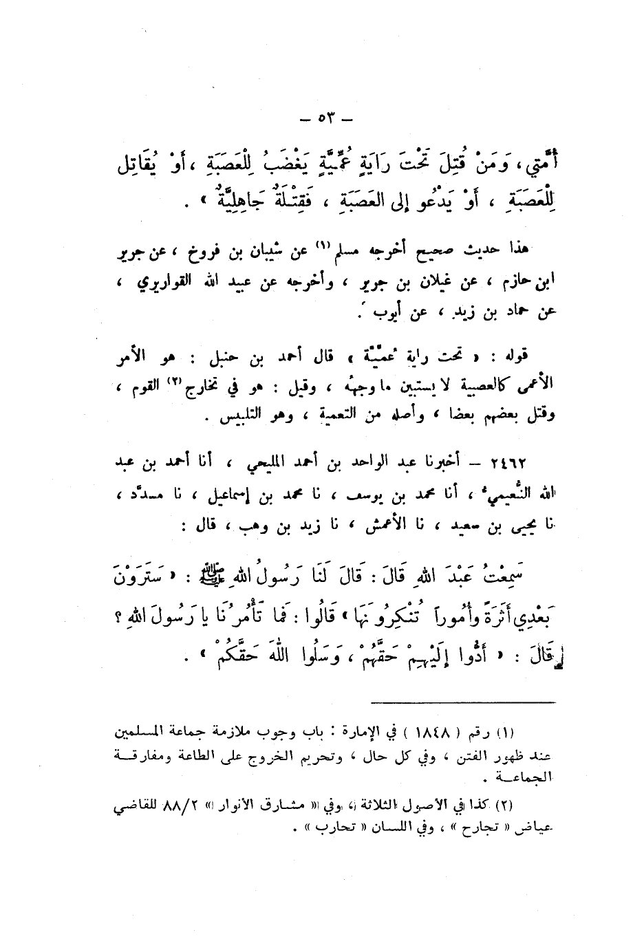 أُمَّتِي، وَمَنْ قُتِلَ تَحْتَ رَايَةٍ عُمِّيَّةٍ يَغْضَبُ للعَصَبَةِ، أَوْ يُقَاتِلُ لِلْعَصَبَةِ، أَوْ يَدْعُو إِلَى الْعَصَبَةِ، فَقِتْلَةٌ جَاهِلِيَّةٌ».