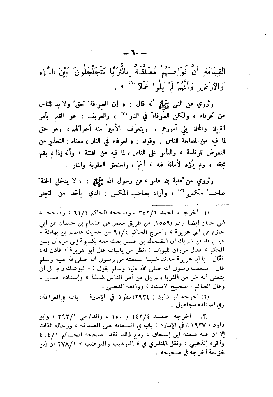 وَرُوِيَ عَنِ النَّبِيِّ صَلَّى اللهُ عَلَيْهِ وَسَلَّمَ، أَنَّهُ قَالَ: «إنَّ الْعِرَافَةَ حَقٌّ وَلا بُدَّ لِلنَّاسِ مِن عُرَفَاءَ، وَلَكِنَّ الْعُرَفَاءَ فِي النَّارِ»، وَالْعَرِّيفُ: هُوَ الْقَيِّمُ بِأَمْرِ الْقَبِيلَةِ وَالْمَحَلَّةِ يَلِي أُمُورَهُمْ، وَيَتَعَرَّفُ الأَمِيرُ مِنْهُ أَحْوَالَهُمْ، وَهُوَ حَقٌّ لِمَا فِيهِ مِنَ الْمَصْلَحَةِ لِلنَّاسِ.