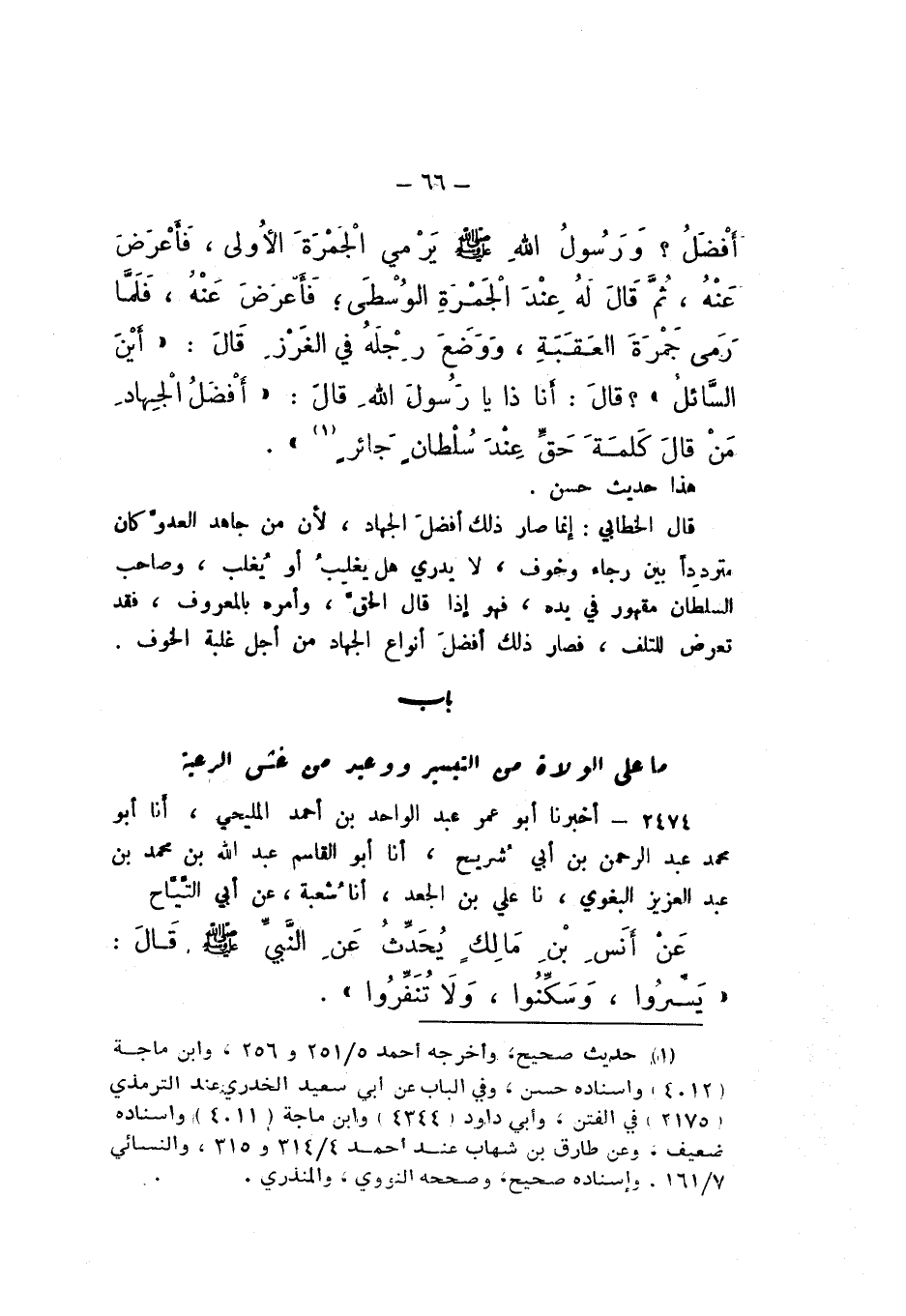أَفْضَلُ؟ وَرَسُولُ اللَّهِ يَرْمِي الْجَمْرَةَ الأُولَى، فَأَعْرَضَ عَنْهُ، ثمَّ قَالَ لَهُ عِنْدَ الْجَمْرَةِ الْوُسْطَى، فَأَعْرَضَ عَنْهُ، فَلَمَّا رَمَى جَمْرَةَ العَقَبَةِ، وَوَضَعَ رِجْلَهُ فِي الْغَرْزِ قَالَ: «أَيْنَ السَّائِلُ»؟ قَالَ: أَنَا ذَا يَا رَسُولَ اللَّهِ، قَالَ: «أَفْضَلُ الْجِهادِ مَنْ قَالَ كَلِمَةَ حَقٍّ عِنْدَ سُلْطَانٍ جَائِرٍ».