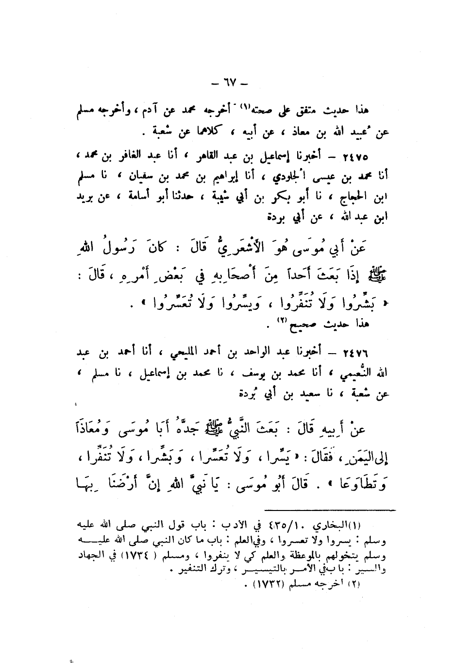 2476 - أَخْبَرَنَا عَبْدُ الْوَاحِدِ بْنُ أَحْمَدَ الْمَلِيحِيُّ، أَنا 25 أَحْمَدُ بْنُ عَبْدِ اللَّهِ النُّعَيْمِيُّ، أَنا مُحَمَّدُ بْنُ يُوسُفَ، نَا مُحَمَّدُ بْنُ إِسْمَاعِيلَ، نَا مُسْلِمٌ، عَنْ شُعْبَةَ، نَا سَعِيدُ بْنُ أَبِي بُرْدَةَ، عَنْ أَبِيهِ، قَالَ: بَعَثَ النَّبيُّ صَلَّى اللهُ عَلَيْهِ وَسَلَّمَ جدَّهُ أَبَا مُوسَى وَمُعَاذًا إِلَى اليَمَنِ، فَقَالَ: «يَسِّرا، وَلا تُعَسِّرا، وَبَشِّرا، وَلا تُنَفِّرَا، وَتَطَاوَعَا»، قَالَ أَبُو مُوسَى: يَا نَبِيَّ اللَّهِ إنَّ أرْضَنَا بِهَا