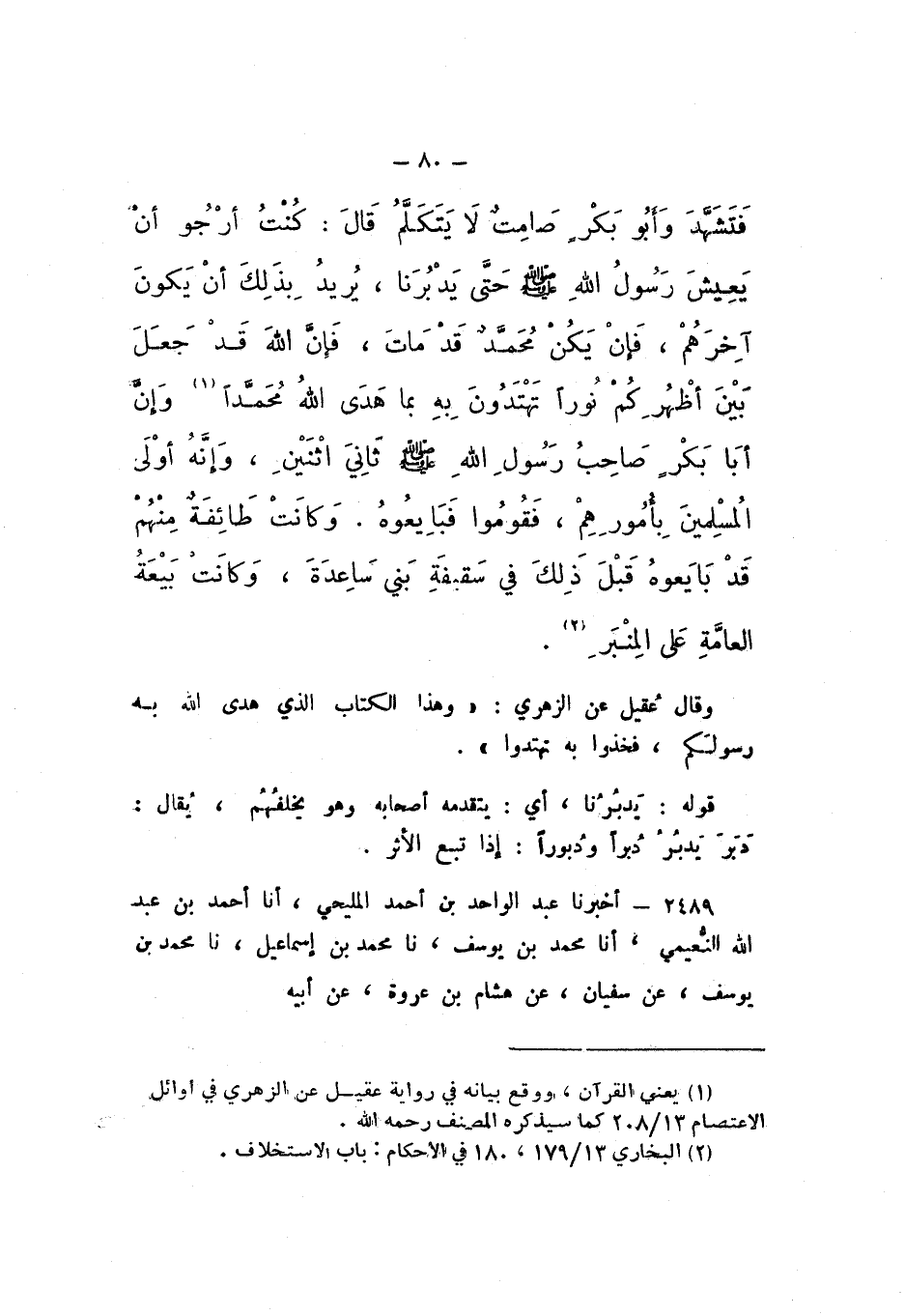 فَتَشَهَّدَ، وأَبُو بَكْرٍ صَامِتٌ لَا يَتَكَلَّمُ، قَالَ: «كُنْتُ أَرْجُو أَنْ يَعِيشَ رَسُولُ اللَّهِ صَلَّى اللهُ عَلَيْهِ وَسَلَّمَ حتَّى يَدْبُرَنَا، يُرِيدُ بِذَلِكَ أنْ يَكُونَ آخِرَهُمْ، فإنْ يَكُنْ مُحَمَّدٌ قَدْ مَاتَ، فَإِنَّ اللَّهَ قدْ جَعَلَ بَيْنَ أَظْهُرِكُمْ نُورًا تَهْتَدُونَ بِه بِمَا هَدَى اللَّهُ مُحَمَّدًا، وَإِنَّ أَبَا بَكْرٍ صَاحِبُ رَسُولِ اللَّهِ صَلَّى اللهُ عَلَيْهِ وَسَلَّمَ ثَانِيَ اثْنَيْنِ، وَإِنَّهُ أَوْلَى المُسْلِمينَ بِأُمُورِهِمْ، فَقُومُوا فَبَايِعُوهُ»، وَكَانَتْ طَائِفَةٌ مِنْهُمْ قَدْ بَايَعُوهُ قَبْلَ ذَلِكَ فِي سَقِيفَةِ بَنِي سَاعِدَةَ، وَكَانَتْ بَيْعَةُ الْعَامَّةِ عَلَى الْمِنْبَرِ.