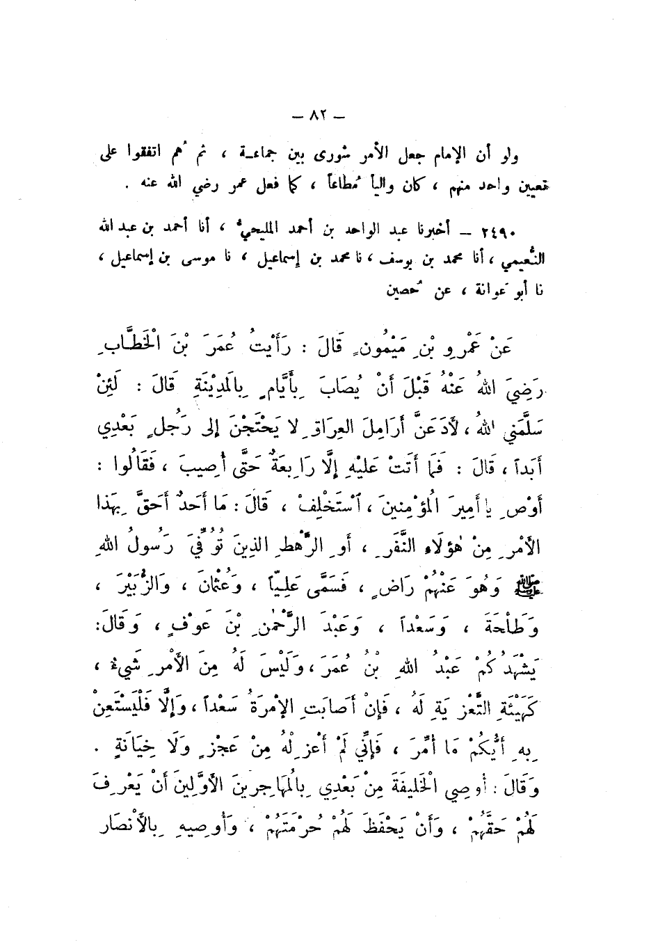 2491 - أَخْبَرَنَا عَبْدُ الْوَاحِدِ بْنُ أَحْمَدَ الْمَلِيحِيُّ، أَنا أَحْمَدُ بْنُ عَبْدِ اللَّهِ النُّعَيْمِيُّ، أَنا مُحَمَّدُ بْنُ يُوسُفَ، نَا مُحَمَّدُ بْنُ إِسْمَاعِيلَ، نَا مُوسَى بْنُ إِسْمَاعِيلَ، نَا أَبُو عَوَانَةَ، عَنْ حُصَيْنٍ، عَنْ عَمْرِو بْنِ مَيْمونٍ، قَالَ: رَأَيْتُ عُمَرَ بْنَ الخَطَّابِ رَضِيَ اللَّهُ عَنْهُ قَبْلَ أَنْ يُصَابَ بأَيَّامٍ بِالْمَدِينَةِ، قَالَ: «لَئِنْ سلمني اللَّهُ، لأدَعَنَّ أَرامِلَ الْعِرَاقِ لَا يَحْتَجْنَ إِلَى رَجُلٍ بَعْدِي أَبَدًا»، قَالَ: فَمَا أَتَتْ عَلَيْهِ إِلا رَابِعَةٌ حتَّى أُصِيبَ، فَقَالُوا: أَوْصِ يَا أَمِيرَ الْمُؤْمِنِينَ، اسْتَخْلِفْ، قَالَ: " مَا أَحَدٌ أَحَقَّ بِهَذَا الأَمْرِ مِنْ هَؤُلاءِ النَّفَرِ، أَوِ الرَّهطِ الَّذِينَ تُوُفِّيَ رسُولُ اللَّهِ صَلَّى اللهُ عَلَيْهِ وَسَلَّمَ وَهُوَ عَنْهُمْ رَاضٍ، فَسَمَّى عَلِيًّا، وَعُثْمَانَ، وَالزُّبَيْرَ، وَطَلْحَةَ، وَسَعْدًا، وَعَبْدَ الرَّحْمَنِ بنَ عَوْفٍ، وَقَالَ: يَشْهَدُكُمْ عَبْدُ اللَّهِ بْنُ عُمَرَ، وَلَيْسَ لهُ مِنَ الأَمْرِ شَيْءٌ، كَهَيْئةِ التَّعْزِيَةِ لَهُ، فَإِنْ أَصَابَتِ الإِمْرَةُ سَعْدًا، وَإِلا فَلْيَسْتَعِنْ بِهِ أَيُّكُمْ مَا أُمِّرَ، فَإِنِّي لَمْ أَعْزِلْهُ مِنْ عَجْزٍ وَلا خِيَانَةٍ.