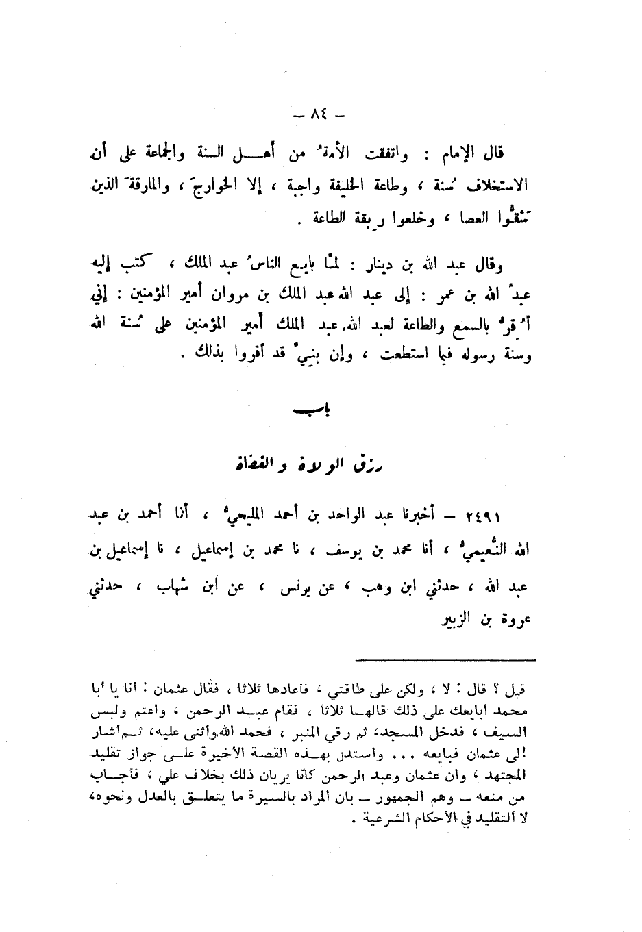 قَالَ الإِمَامُ: وَاتَّفَقَتِ الأُمَّةُ مِنْ أَهْلِ السُّنَّةِ وَالْجَمَاعَةِ عَلَى أَنَّ الاسْتِخْلافِ سُنَّةٌ، وَطَاعَةُ الْخَلِيفَةِ وَاجِبَةٌ، إِلا الْخَوَارِجَ، وَالْمَارِقَةَ الَّذِينَ شَقُّوا الْعَصَا، وَخَلَعُوا رِبْقَةَ الطَّاعَةِ.