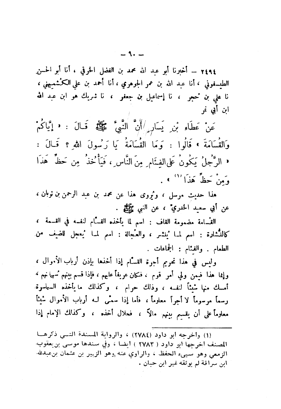 2495 - أَخْبَرَنَا أَبُو عَبْدِ اللَّهِ مُحَمَّدُ بْنُ الْفَضْلِ الْخَرَقِيُّ، أَنا أَبُو الْحَسَنِ الطَّيْسَفُونِيُّ، أَنا عَبْدُ اللَّهِ بْنُ عُمَرَ الْجَوْهَرِيُّ، أَنا أَحْمَدُ بْنُ عَلِيٍّ الْكُشْمِيهَنِيُّ، نَا عَلِيُّ بْنُ حُجْرٍ، نَا إِسْمَاعِيلُ بْنُ جَعْفَرٍ، نَا شَرِيكُ هُوَ ابْنُ عَبْدِ اللَّهِ بْنِ أَبِي نَمِرٍ، عَنْ عَطَاءِ بْنِ يَسَارٍ، أَنَّ النَّبيَّ صَلَّى اللهُ عَلَيْهِ وَسَلَّمَ، قَالَ: «إِيَّاكُمْ وَالْقُسَامَةَ» قَالُوا: وَمَا القُسَامَةُ يَا رَسُولَ اللَّهِ؟ قَالَ: «الرَّجُلُ يَكُونُ عَلَى الْفِئَامِ مِنَ النَّاسِ، فَيَأْخُذُ مِنْ حَظِّ هَذَا وَمِنْ حَظِّ هَذَا».