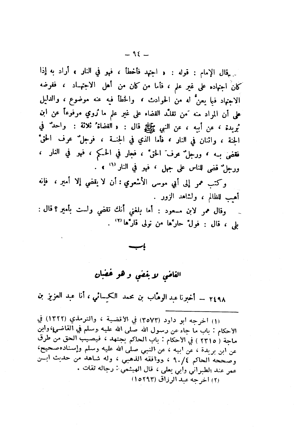 قَالَ الإِمَامُ: قَوْلُهُ «اجْتَهد فَأَخْطَأَ، فَهُوَ فِي النَّارِ» أَرَادَ بِهِ: إِذَا كَانَ اجْتِهَادُهُ عَلَى غَيْرِ عِلْمٍ، فَأَمَّا مَنْ كَانَ مِنْ أَهْلِ الاجْتِهَادِ فَفَرْضُهُ الاجْتِهَادُ فِيمَا يَعِنُّ لَهُ مِنَ الْحَوَادِثِ، وَالْخَطَأُ فِيهِ عَنْهُ مَوْضُوعٌ، وَالدَّلِيلُ عَلَى أَنَّ الْمُرَادَ مِنْهُ: مَنْ تَقَلَّدَ الْقَضَاءَ عَلَى غَيْرِ عِلْمٍ، مَا رُوِيَ مَرْفُوعًا عَنِ ابْنِ بُرَيْدَةَ، عَنْ أَبِيهِ، عَنِ النَّبِيِّ صَلَّى اللهُ عَلَيْهِ وَسَلَّمَ، قَالَ: " الْقُضَاةُ ثَلاثَةٌ: وَاحِدٌ فِي الْجَنَّةِ، وَاثْنَانِ فِي النَّارِ، فَأَمَّا الَّذِي فِي الْجَنَّةِ، فَرَجُلٌ عَرَفَ الْحَقَّ فَقَضَى بِهِ، وَرَجُلٌ عَرَفَ الْحقِّ، فَجَارَ فِي الْحُكْمِ، فَهُوَ فِي النَّارِ، وَرَجُلٌ قَضَى لِلنَّاسِ عَلَى جَهْلٍ، فَهُوَ فِي النَّارِ ".