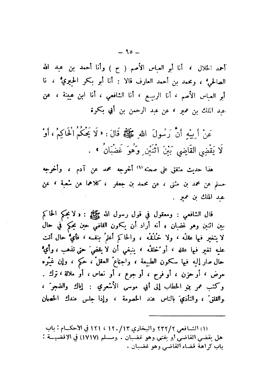 ح، وَأَنا أَحْمَدُ بْنُ عَبْدِ اللَّهِ الصَّالِحِيُّ، وَمُحَمَّدُ بْنُ أَحْمَدَ الْعَارِفُ، قَالا: أَنا أَبُو بَكْرٍ الْحِيرِيُّ، نَا أَبُو الْعَبَّاسِ الأَصَمُّ، أَنا الرَّبِيعُ، أَنا الشَّافِعِيُّ، أَنا ابْنُ عُيَيْنَةَ، عَنْ عَبْدِ الْمَلِكِ بْنِ عُمَيْرٍ، عَنْ عَبْدِ الرَّحْمَنِ بْنِ أَبِي بَكْرَةَ، عَنْ أَبِيهِ، أَنّ رسُولَ اللَّهِ صَلَّى اللهُ عَلَيْهِ وَسَلَّمَ، قَالَ: «لَا يَحْكُمُ الْحَاكِمُ، أَوْ لَا يَقْضِي الْقَاضِي بَيْنَ اثْنَيْنِ وَهُوَ غَضْبَانُ».