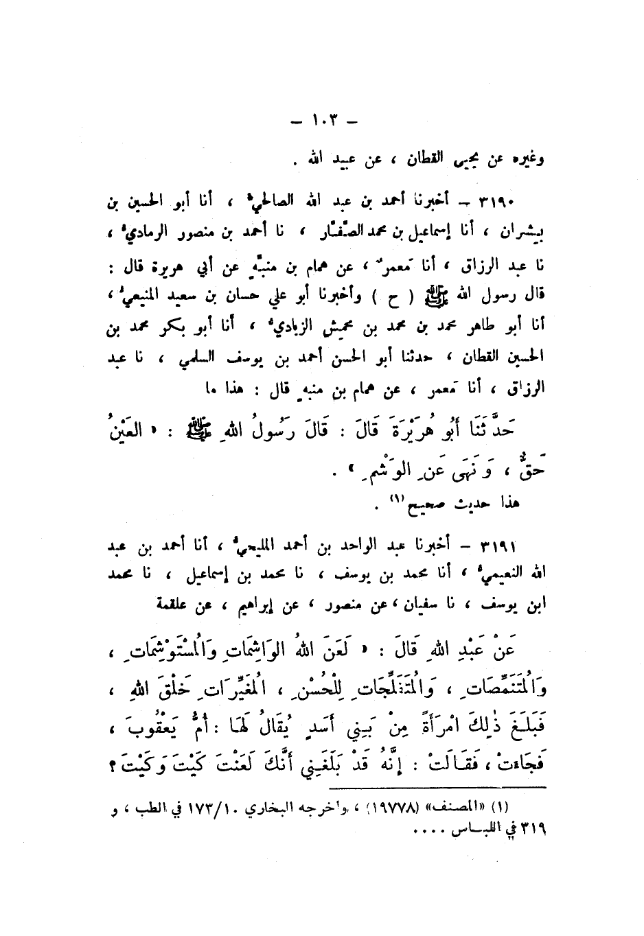 ح وَأَخْبَرَنَا أَبُو عَلِيٍّ حَسَّانُ بْنُ سَعِيدٍ الْمَنِيعِيُّ، أَنا أَبُو طَاهِرٍ مُحَمَّدُ بْنُ مُحَمَّدِ بْنِ مَحْمِشٍ الزِّيَادِيُّ، أَنا أَبُو بَكْرٍ مُحَمَّدُ بْنُ الْحُسَيْنِ الْقَطَّانُ، حَدَّثَنَا أَبُو الْحَسَنِ أَحْمَدُ بْنُ يُوسُفَ السُّلَمِيُّ، نَا عَبْدُ الرَّزَّاقِ، أَنا مَعْمَرٌ، عَنْ هَمَّامِ بْنِ مُنَبِّهٍ، قَالَ: هَذَا مَا حَدَّثَنَا أَبُو هُرَيْرَةَ، قَالَ: قَالَ رَسُولُ اللَّهِ صَلَّى اللهُ عَلَيْهِ وَسَلَّمَ: «الْعَيْنُ حَقٌّ، وَنَهَى عَنِ الْوَشْمِ».