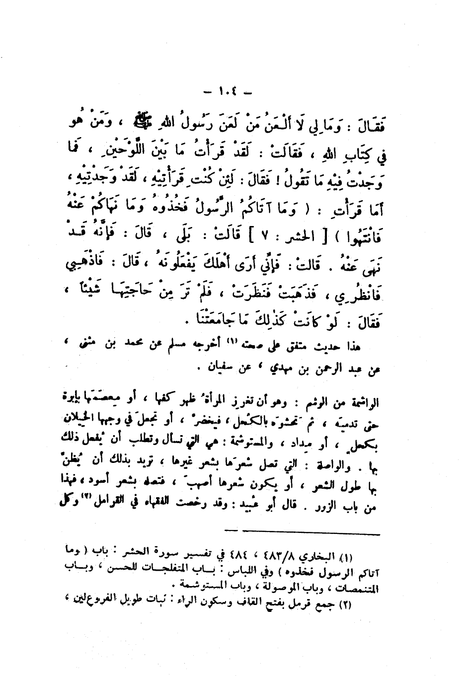 فَقَالَ: وَمَا لِي لَا أَلْعَنُ مَنْ لَعَنَ رَسُولُ اللَّهِ صَلَّى اللهُ عَلَيْهِ وَسَلَّمَ، وَمَنْ هُوَ فِي كِتَابِ اللَّهِ، فَقَالَتْ: لَقَدْ قَرَأْتُ مَا بَيْنَ اللَّوْحَيْنِ، فَمَا وَجَدْتُ فِيهِ مَا تَقُولُ! فَقَالَ: لَئِنْ كُنْتِ قَرَأْتِيهِ، لَقَدْ وَجَدْتِيهِ، أَمَا قَرَأْتِ: {وَمَا آتَاكُمُ الرَّسُولُ فَخُذُوهُ وَمَا نَهَاكُمْ عَنْهُ فَانْتَهُوا} [الْحَشْر: 7]، قَالَتْ: بَلَى، قَالَ: فَإِنَّهُ قَدْ نَهَى عَنْهُ، قَالَتْ: فَإِنِّي أَرَى أَهْلَكَ يَفْعَلُونَهُ، قَالَ: فَاذْهَبِي فَانْظُرِي، فَذَهَبَتْ فَنَظَرَتْ، فَلَمْ تَرَ مِنْ حَاجَتِهَا شَيْئًا، فَقَالَ: لَوْ كَانَتْ كَذَلِكَ مَا جَامَعَتْنَا ".