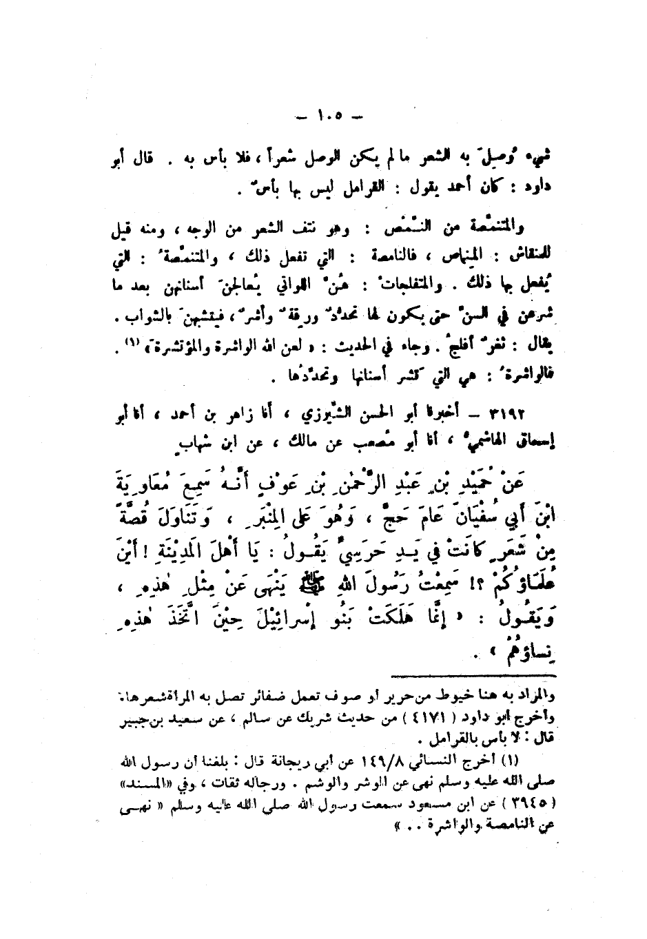3192 - أَخْبَرَنَا أَبُو الْحَسَنِ الشِّيرَزِيُّ، أَنا زَاهِرُ بْنُ أَحْمَدَ، أَنا أَبُو إِسْحَاقَ الْهَاشِمِيُّ، أَنا أَبُو مُصْعَبٍ، عَنْ مَالِكٍ، عَنِ ابْنِ شِهَابٍ، عَنْ حُمَيْدِ بْنِ عَبْدِ الرَّحْمَنِ بْنِ عَوْفٍ، أَنَّهُ سَمِعَ مُعَاوِيَةَ بْنَ أَبِي سُفْيَانَ، عَامَ حَجَّ، وَهُوَ عَلَى الْمِنْبَرِ، وَتَنَاوَلَ قُصَّةً مِنْ شَعْرٍ كَانَتْ فِي يَدِ حَرَسِيٍّ، يَقُولُ: يَأَهْلَ الْمَدِينَةِ أَيْنَ عُلَمَاؤكُمْ؟! سَمِعْتُ رَسُولَ اللَّهِ صَلَّى اللهُ عَلَيْهِ وَسَلَّمَ يَنْهَى عَنْ مثْلِ هَذِهِ، وَيَقُولُ: «إِنَّمَا هَلَكَتْ بَنُو إِسْرائِيلَ حِينَ اتَّخَذَ هَذِهِ نِسَاؤُهُمْ».