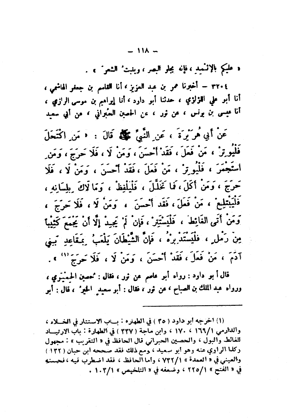 3204 - أَخْبَرَنَا عُمَرُ بْنُ عَبْدِ الْعَزِيزِ، أَنا الْقَاسِمُ بْنُ جَعْفَرٍ الْهَاشِمِيُّ، أَنا أَبُو عَلِيٍّ اللُّؤْلُئِيُّ، حَدَّثَنَا أَبُو دَاوُدَ، أَنا إِبْرَاهِيمُ بْنُ مُوسَى الرَّازِيُّ، أَنا عِيسَى بْنُ يُونُسَ، عَنْ ثَوْرٍ، عَنِ الْحُصَيْنِ الْحُبْرَانِيِّ، عَنْ أَبِي سَعِيدٍ، عَنْ أَبيِ هُرَيْرَةَ، عَنِ النَّبيِّ صَلَّى اللهُ عَلَيْهِ وَسَلَّمَ، قَالَ: «مَنِ اكْتَحَلَ فَلْيُوتِرْ، مَنْ فَعَلَ فَقَدْ أَحْسَنَ، وَمَنْ لَا، فَلا حَرَجَ، وَمَنِ استَجْمَرَ فَلْيُوتِرْ، مَنْ فَعَلَ فَقَدْ أَحْسَنَ، وَمَنْ لَا، فَلا حَرَجَ، وَمَنْ أَكَلَ فَما تَخَلَّلَ فَلْيَلْفِظْ، وَمَا لاكَ بِلِسَانِهِ فَلْيَبْتَلِعْ، مَنْ فَعَلَ فَقَدْ أَحْسَنَ، وَمَنْ لَا، فَلا حَرَجَ، وَمَنْ أَتَى الغَائِطَ فَلْيَسْتَتِرْ، فَإِنْ لَمْ يَجِدْ إِلا أَنْ يَجْمَعَ كَثِيبًا مِنْ رَمْلٍ فلْيَسْتَدْبِرْهُ، فَإِنَّ الشَّيْطَانَ يَلْعَبُ بِمَقَاعِدِ بَنِي آدَمَ، مَنْ فَعَلَ فَقَدْ أَحْسَنَ، وَمَنْ لَا، فَلا حَرَجَ».