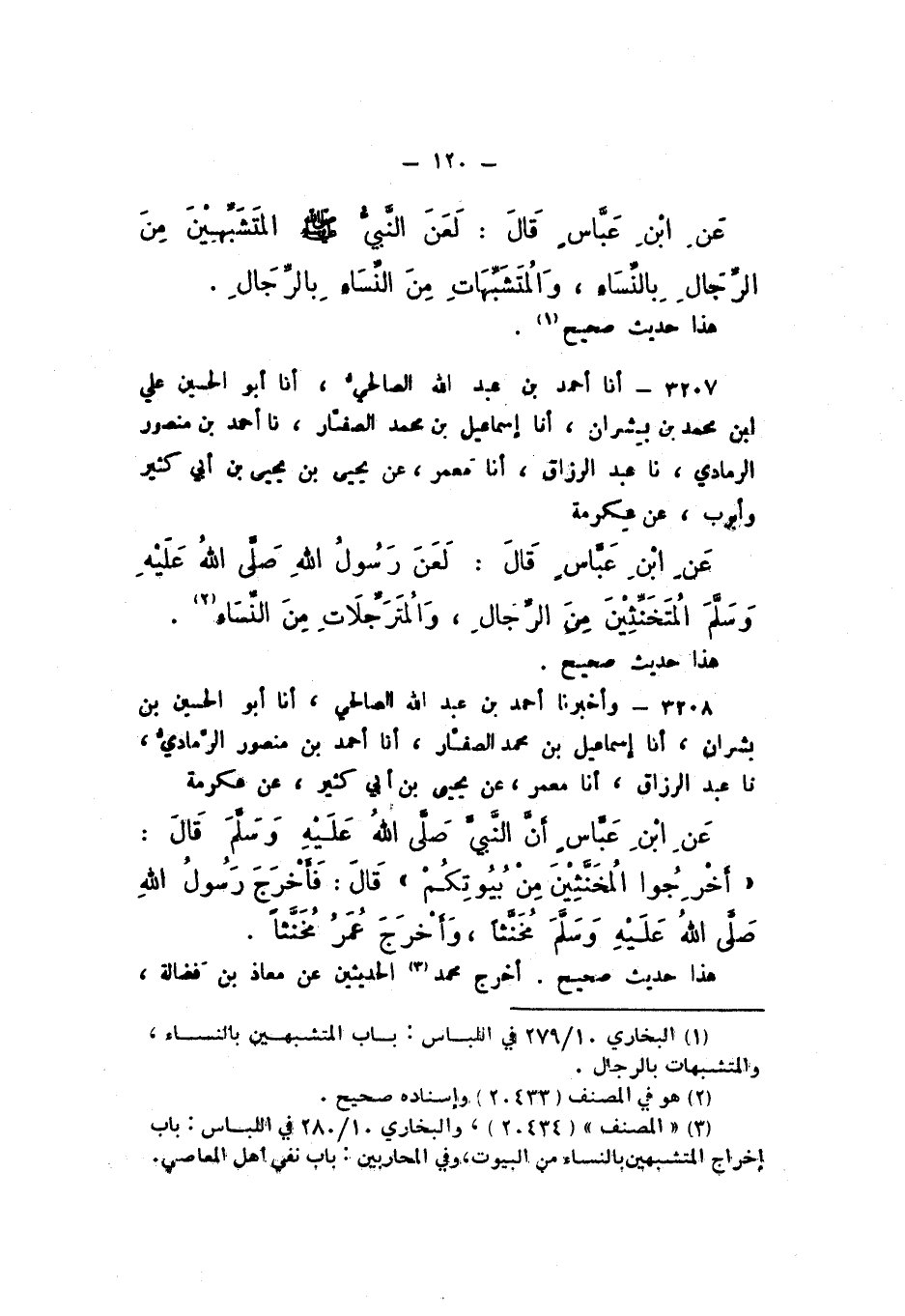 3207 - أَنا أَحْمَدُ بْنُ عَبْدِ اللَّهِ الصَّالِحِيُّ، أَنا أَبُو الْحُسَيْنِ عَلِيُّ بْنُ مُحَمَّدِ بْنِ بِشْرَانَ، أَنا إِسْمَاعِيلُ بْنُ مُحَمَّدٍ الصَّفَّارُ، نَا أَحْمَدُ بْنُ مَنْصُورٍ الرَّمَادِيُّ، نَا عَبْدُ الرَّزَّاقِ، أَنا مَعْمَرٌ، عَنْ يَحْيَى بْنِ يَحْيَى بْنِ أَبِي كَثِيرٍ، وَأَيُّوبَ، عَنْ عِكْرِمَةَ، عَنِ ابْنِ عَبَّاسٍ، قَالَ: «لَعَنَ رَسُولُ اللَّهِ صَلَّى اللهُ عَلَيْهِ وَسَلَّمَ الْمُتَخَنِّثِينَ مِنَ الرِّجَالِ، وَالْمُتَرَجِّلاتِ مِنَ النِّسَاءِ».