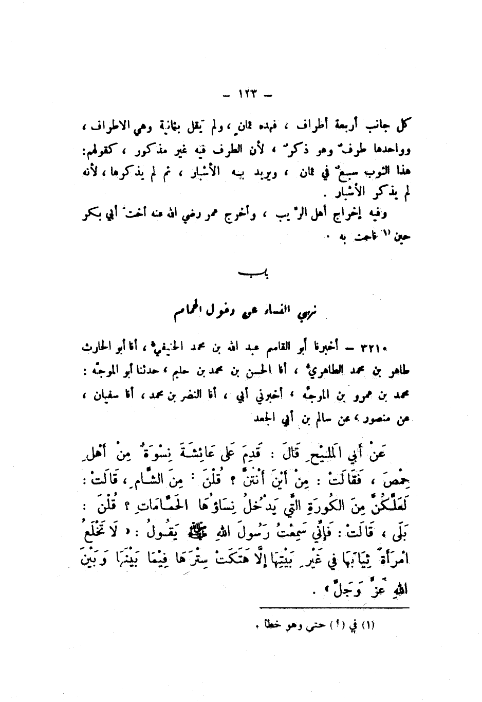 3210 - أَخْبَرَنَا أَبُو الْقَاسِمِ عَبْدُ اللَّهِ بْنُ مُحَمَّدٍ الْحَنِيفِيُّ، أَنا أَبُو الْحَارِثِ طَاهِرُ بْنُ مُحَمَّدٍ الطَّاهِرِيُّ، أَنا الْحَسَنُ بْنُ مُحَمَّدِ بْنِ حَلِيمٍ، حَدَّثَنَا أَبُو الْمُوَجِّهِ مُحَمَّدُ بْنُ عَمْرِو بْنِ الْمُوَجِّهِ، أَخْبَرَنِي أَبِي، أَنا النَّضْرُ بْنُ مُحَمَّدٍ، أَنا سُفْيَانُ، عَنْ مَنْصُورٍ، عَنْ سَالِمِ بْنِ أَبِي الْجَعْدِ، عَنْ أَبِي الْمَلِيحِ، قَالَ: " قَدِمَ عَلَى عَائِشَةَ نِسْوَةٌ مِنْ أَهْلِ حِمْصَ، فَقَالَتْ: مِنْ أَيْنَ أَنْتُنَّ؟ قُلْنَ: مِنَ الشَّامِ، قَالَتْ: لَعَلَّكُنَّ مِنَ الْكُورَةِ الَّتِي يَدْخُلُ نِسَاؤُهَا الْحَمَّامَاتِ؟ قُلْنَ: بَلَى، قَالَتْ: فَإِنِّي سَمِعْتُ رَسُولَ اللَّهِ صَلَّى اللهُ عَلَيْهِ وَسَلَّمَ يَقُولُ: لَا تَخْلَعُ امْرَأَةٌ ثِيَابَهَا فِي غَيْرِ بَيْتِهَا إِلا هَتَكَتْ سِتْرَهَا فِيمَا بَيْنَهَا وَبَيْنَ اللَّهِ عَزَّ وَجَلَّ ".
