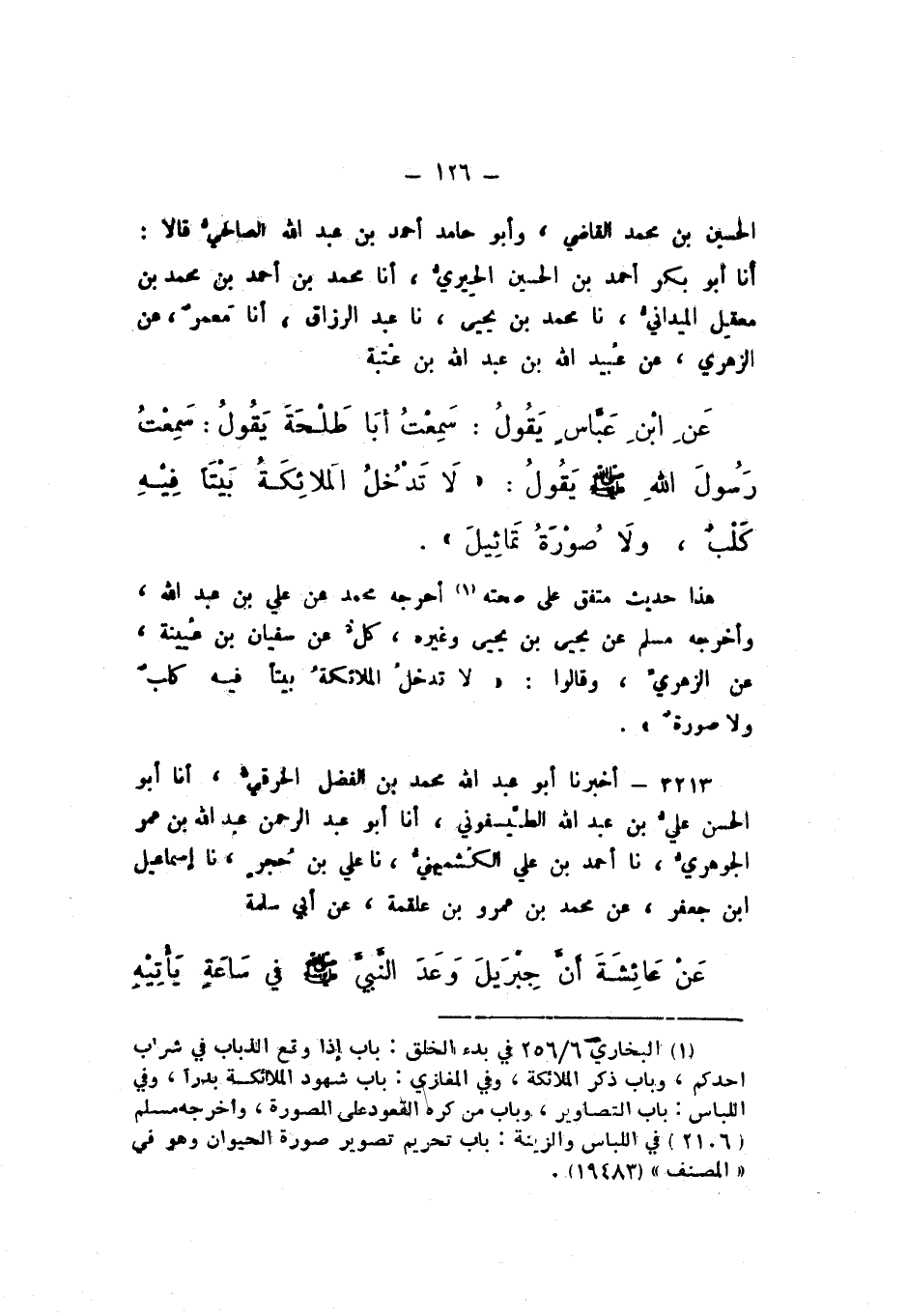 الْحُسَيْنُ بْنُ مُحَمَّدٍ الْقَاضِي، وَأَبُو حَامِدٍ أَحْمَدُ بْنُ عَبْدِ اللَّهِ الصَّالِحِيُّ، قَالا: أَنا أَبُو بَكْرٍ أَحْمَدُ بْنُ الْحُسَيْنِ الْحِيرِيُّ، أَنا مُحَمَّدُ بْنُ أَحْمَدَ بْنِ مُحَمَّدِ بْنِ مَعْقِلٍ الْمَيْدَانِيُّ، نَا مُحَمَّدُ بْنُ يَحْيَى، نَا عَبْدُ الرَّزَّاقِ، أَنا مَعْمَرٌ، عَنِ الزُّهْرِيِّ، عَنْ عُبَيْدِ اللَّهِ بْنِ عَبْدِ اللَّهِ بْنِ عُتْبَةَ، عَنِ ابْنِ عَبَّاسٍ يَقُولُ: سَمِعْتُ أَبَا طَلْحَةَ، يَقُولُ: سَمِعْتُ رَسُولَ اللَّهِ صَلَّى اللهُ عَلَيْهِ وَسَلَّمَ، يَقُولُ: «لَا تَدْخُلُ الْمَلائِكَةُ بَيْتًا فِيهِ كَلْبٌ، وَلا صُورَةُ تَمَاثِيلَ».