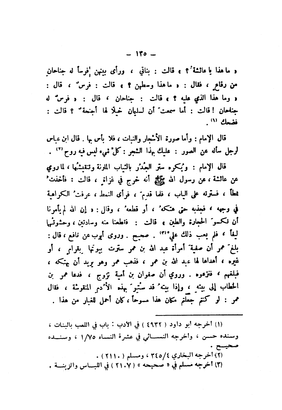 مَا هَذَا يَا عَائِشَةُ؟ قَالَتْ: بَنَاتِي، وَرَأَى بَيْنَهُنَّ فَرَسًا لَهُ جِنَاحَانِ مِنْ رِقَاعٍ، فَقَالَ: مَا هَذَا وَسَطَهُنَّ؟ قَالَتْ: فَرَسٌ، قَالَ: وَمَا هَذَا الَّذِي عَلَيْهِ؟ قَالَتْ: جَنَاحَانِ، قَالَ: فَرَسٌ لَهُ جَنَاحَانِ! قَالَتْ: أَمَا سَمِعْتَ أَنَّ لِسُلَيْمَانَ خَيْلا لَهَا أَجْنِحَةٌ؟ قَالَتْ: فَضَحِكَ ".