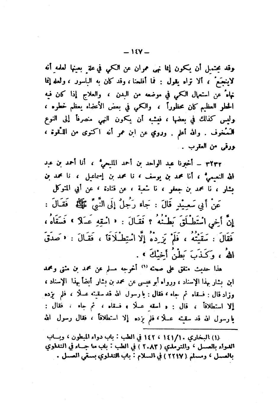 هَذَا حَدِيثٌ مُتَّفَقٌ عَلَى صِحَّتِهِ، أَخْرَجَهُ مُسْلِمٌ، عَنْ مُحَمَّدِ بْنِ مُثَنَّى، وَمُحَمَّدِ بْنِ بَشَّارٍ، بِهَذَا الإِسْنَادِ، وَرَوَاهُ أَبُو عِيسَى، عَنْ مُحَمَّدِ بْنِ بَشَّارٍ، أَيْضًا بِهَذَا الإِسْنَادِ، وَزَادَ قَالَ: فَسَقَاهُ، ثُمَّ جَاءَ فَقَالَ: يَا رَسُولَ اللَّهِ، قَدْ سَقَيْتُهُ عَسَلا، فَلَمْ يَزِدْهُ إِلا اسْتِطْلاقًا، قَالَ: اسْقِهِ عَسَلا، فَسَقَاهُ، ثُمَّ جَاءَ فَقَالَ: يَا رَسُولَ اللَّهِ، قَدْ سَقَيْتُهُ عَسَلا، فَلَمْ يَزِدْهُ إِلا اسْتِطْلاقًا، فَقَالَ رَسُولُ اللَّهِ صَلَّى اللهُ عَلَيْهِ وَسَلَّمَ: «