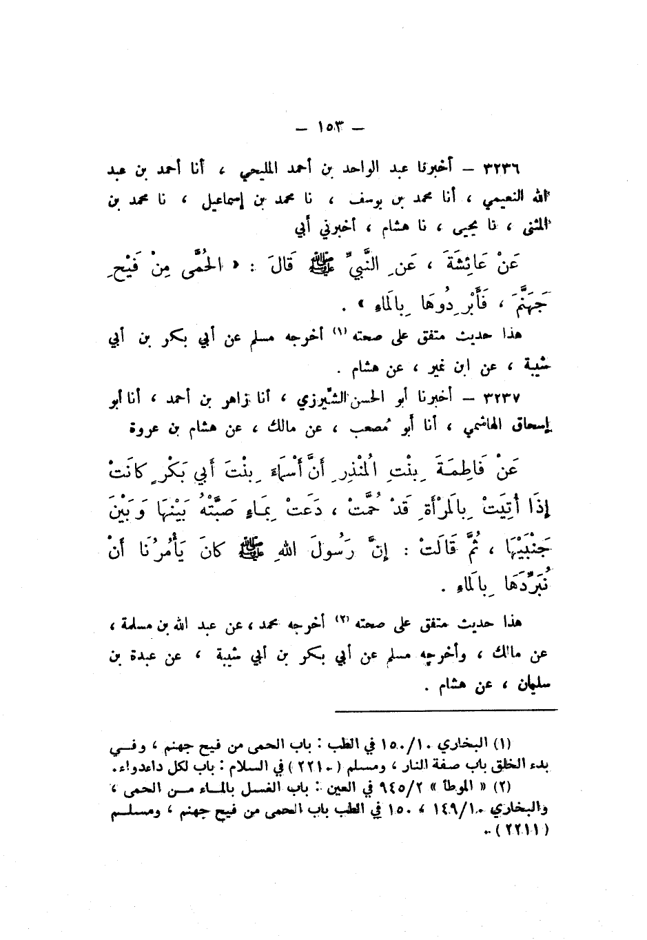 3236 - أَخْبَرَنَا عَبْدُ الْوَاحِدِ بْنُ أَحْمَدَ الْمَلِيحِيُّ، أَنا أَحْمَدُ بْنُ عَبْدِ اللَّهِ النُّعَيْمِيُّ، أَنا مُحَمَّدُ بْنُ يُوسُفَ، نَا مُحَمَّدُ بْنُ إِسْمَاعِيلَ، نَا مُحَمَّدُ بْنُ الْمُثَنَّى، نَا يَحْيَى، نَا هِشَامٌ، أَخْبَرَنِي أَبِي، عَنْ عَائِشَةَ، عَنِ النَّبِيِّ صَلَّى اللهُ عَلَيْهِ وَسَلَّمَ، قَالَ: «الْحُمَّى مِنْ فَيْحِ جَهَنَّمَ، فَأَبْرِدُوهَا بِالْمَاءِ».