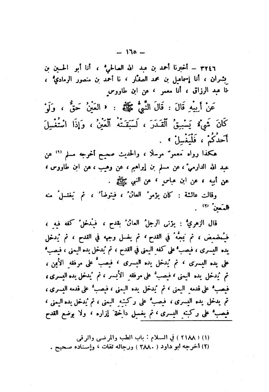 3246 - أَخْبَرَنَا أَحْمَدُ بْنُ عَبْدِ اللَّهِ الصَّالِحِيُّ، أَنا أَبُو الْحُسَيْنِ بْنُ بِشْرَانَ، أَنا إِسْمَاعِيلُ بْنُ مُحَمَّدٍ الصَّفَّارُ، نَا أَحْمَدُ بْنُ مَنْصُورٍ الرَّمَادِيُّ، نَا عَبْدُ الرَّزَّاقِ، أَنا مَعْمَرٌ، عَنِ ابْنِ طَاوُسٍ، عَنْ أَبِيهِ، قَالَ: قَالَ النَّبيُّ صَلَّى اللهُ عَلَيْهِ وَسَلَّمَ: «الْعَيْنُ حَقٌّ، وَلَوْ كَانَ شَيْءٌ يَسْبِقُ الْقَدَرَ، لَسَبقَتْهُ الْعَيْنُ، وَإِذَا اسْتُغْسِلَ أَحَدُكُمْ، فَلْيَغْسِلْ».