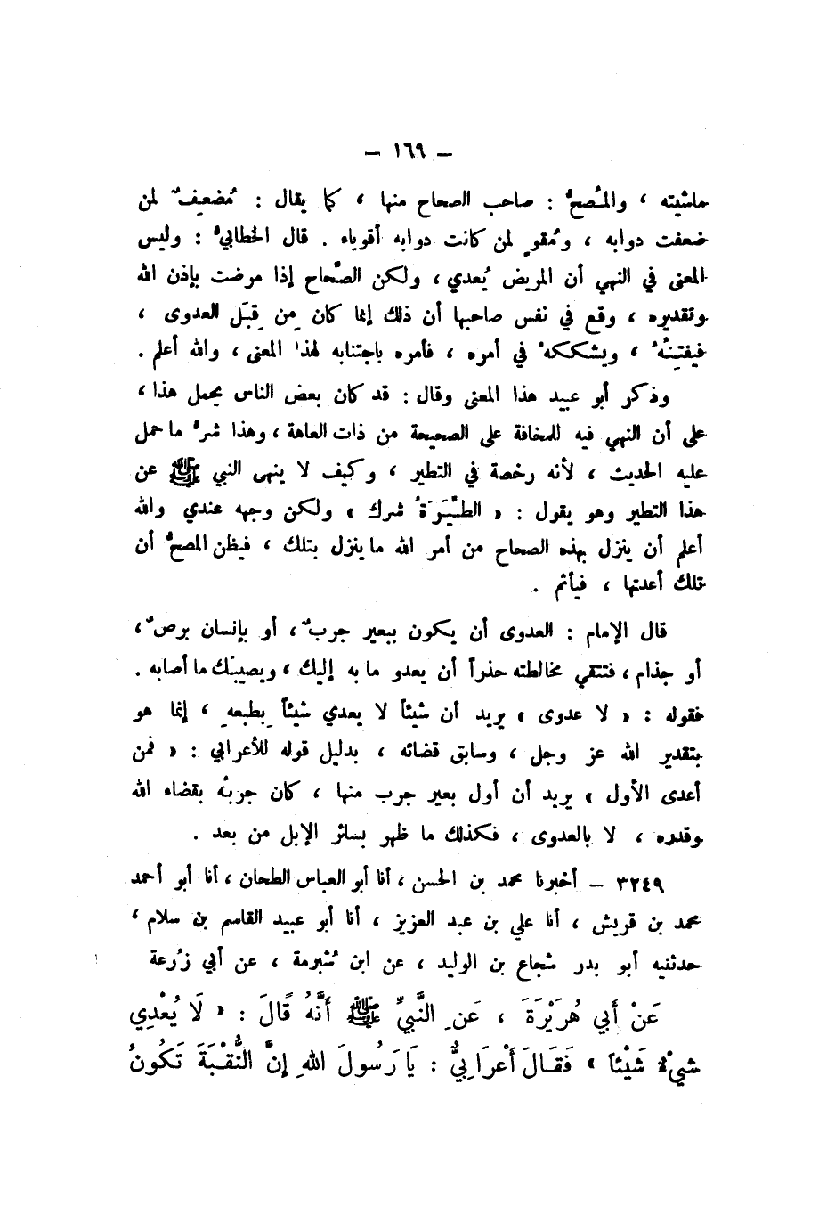 3249 - أَخْبَرَنَا مُحَمَّدُ بْنُ الْحَسَنِ، أَنا أَبُو الْعَبَّاسِ الطَّحَّانُ، أَنا أَبُو أَحْمَدَ مُحَمَّدُ بْنُ قُرَيْشٍ، أَنا عَلِيُّ بْنُ عَبْدِ الْعَزِيزِ، أَنا أَبُو عُبَيْدٍ الْقَاسِمُ بْنُ سَلامٍ، حَدَّثَنِيهِ أَبُو بَدْرٍ شُجَاعُ بْنُ الْوَلِيدِ، عَنِ ابْنِ شُبْرُمَةَ، عَنْ أَبِي زُرْعَةَ، عَنْ أَبيِ هُرَيْرَةَ، عَنِ النَّبيِّ صَلَّى اللهُ عَلَيْهِ وَسَلَّمَ، أَنَّهُ قَالَ: " لَا يُعْدِي شَيْءٌ شَيْئًا، فَقَالَ أَعْرَابِيٌّ: يَا رَسُولَ اللَّهِ، إِنَّ النُّقْبَةَ تَكُونُ