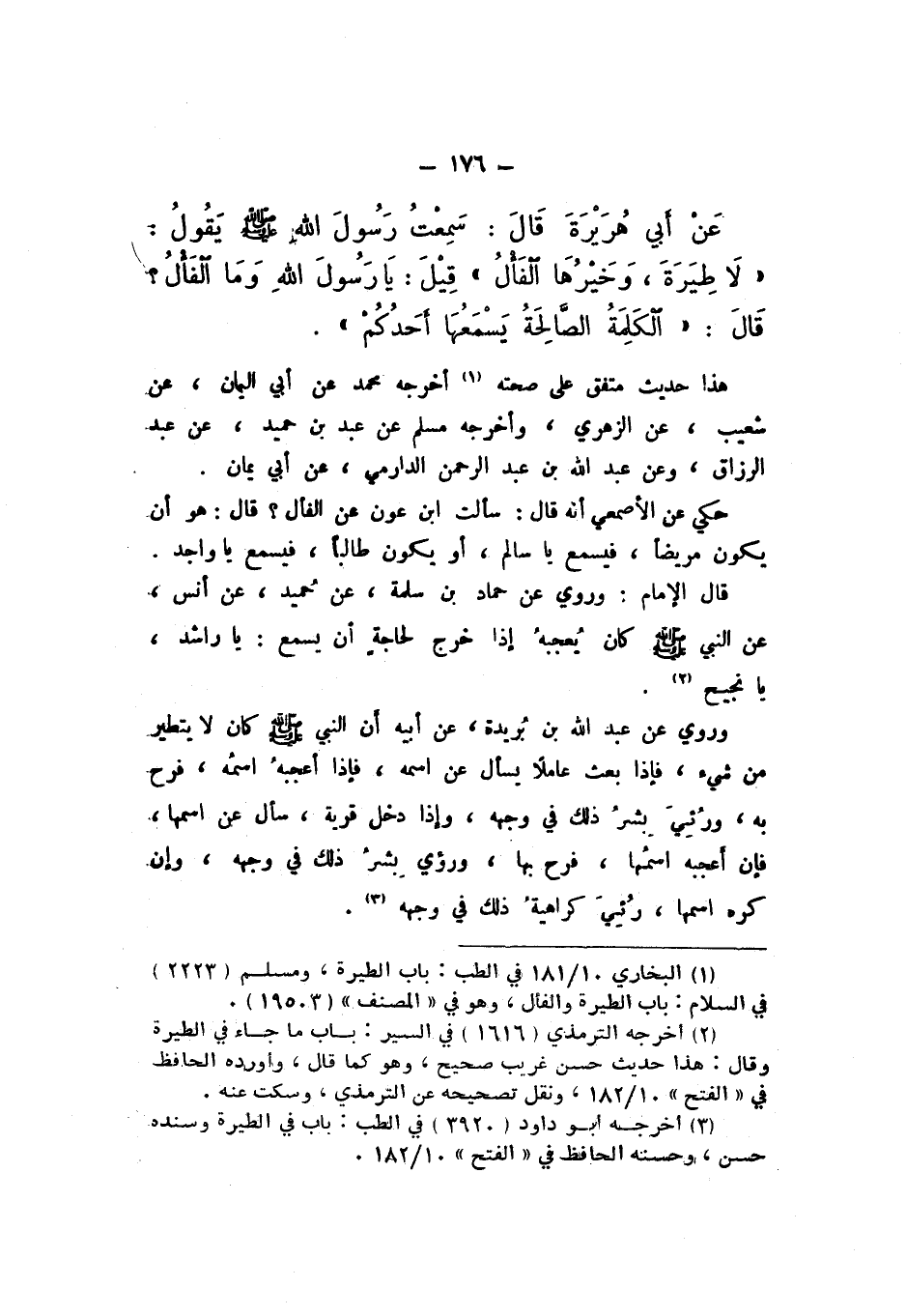 عَنْ أَبيِ هُرَيْرَةَ، قَالَ: سَمِعْتُ رَسُولَ اللَّهِ صَلَّى اللهُ عَلَيْهِ وَسَلَّمَ، يَقُولُ: " لَا طِيَرَةَ، وَخَيْرُهَا الْفَأْلُ، قِيلَ: يَا رَسُولَ اللَّهِ، وَمَا الْفَأْلُ؟ قَالَ: الْكَلِمَةُ الصَّالِحَةُ يَسْمَعُهَا أَحَدُكُمْ ".