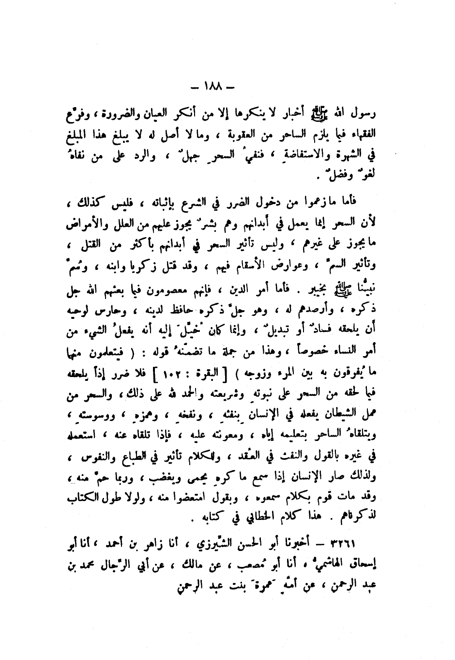 رَسُولِ اللَّهِ صَلَّى اللهُ عَلَيْهِ وَسَلَّمَ أَخْبَارٌ لَا يُنْكِرُهَا إِلا مِنْ أَنْكَرَ الْعِيَانَ وَالضَّرُورَةَ، وَفَرَّعَ الْفُقَهَاءُ فِيمَا يَلْزَمِ السَّاحِرِ مِنَ الْعُقُوبَةِ، وَمَا لَا أَصْلَ لَهُ لَا يَبْلُغُ هَذَا الْمَبْلَغُ فِي الشُّهْرَةِ وَالاسْتِفَاضَةِ، فَنَفْيُ السِّحْرِ جَهْلٌ، وَالرَّدُّ عَلَى مِنْ نَفَاهُ لَغْوٌ وَفَضْلٌ.