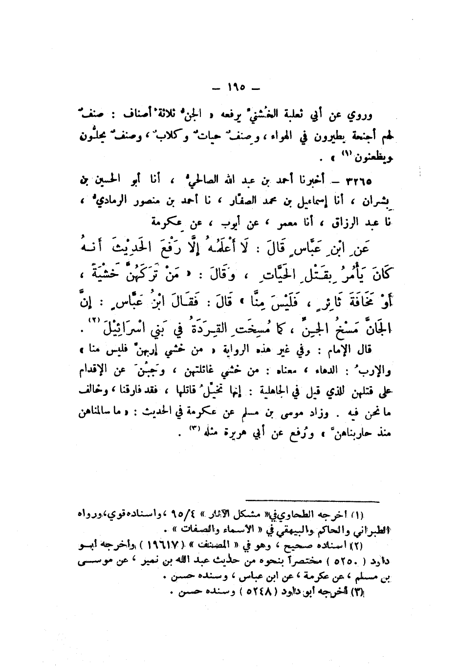 3265 - أَخْبَرَنَا أَحْمَدُ بْنُ عَبْدِ اللَّهِ الصَّالِحِيُّ، أَنا أَبُو الْحُسَيْنِ بْنُ بِشْرَانَ، أَنا إِسْمَاعِيلُ بْنُ مُحَمَّدٍ الصَّفَّارُ، نَا أَحْمَدُ بْنُ مَنْصُورٍ الرَّمَادِيُّ، نَا عَبْدُ الرَّزَّاقِ، أَنا مَعْمَرٌ، عَنْ أَيُّوبَ، عَنْ عِكْرِمَةَ، عَنِ ابْنِ عبَّاسٍ، قَالَ: لَا أَعْلَمُهُ إِلا رَفَعَ الْحَدِيثَ أَنهُ كَانَ يَأْمُرُ بِقَتْلِ الْحَيَّاتِ، وَقَالَ: «مَنْ تَرَكَهُنَّ خَشْيَةً، أَوْ مَخَافَةَ ثَائِرٍ، فَلَيْسَ مِنَّا»، قَالَ: فَقَالَ ابْنُ عَبَّاسٍ: إِنَّ الْجَانَّ مَسْخُ الْجِنِّ، كَمَا مُسِخَتِ الْقِرَدَةُ فِي بَنِي إِسْرَائِيلَ