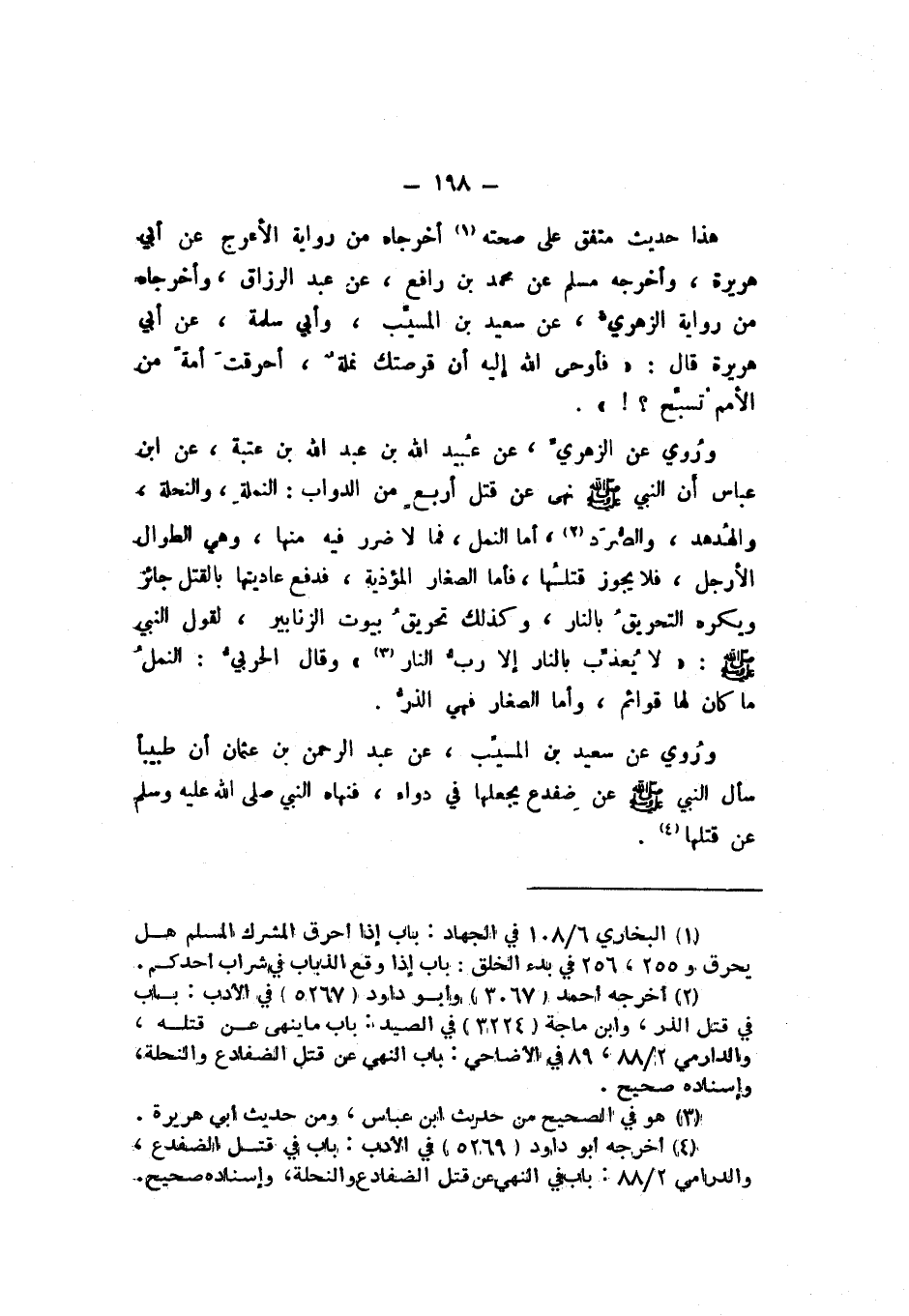 وَرُوِيَ عَنِ الزُّهْرِيِّ، عَنْ عُبَيْدِ اللَّهِ بْنِ عَبْدِ اللَّهِ بْنِ عُتْبَةَ، عَنِ ابْنِ عَبَّاسٍ، " أَنَّ النَّبِيَّ صَلَّى اللهُ عَلَيْهِ وَسَلَّمَ نَهَى عَنْ قَتْلِ أَرْبَعٍ مِنَ الدَّوَابِّ: النَّمْلَةِ، وَالنَّحْلَةِ، وَالْهُدْهُدِ، وَالصُّرَدِ، أَمَّا النَّمْلُ، فَمَا لَا ضَرَرَ فِيهِ مِنْهَا، وَهِيَ الطُّوَالُ الأَرْجُلِ، فَلا يَجُوزُ قَتْلُهَا، فَأَمَّا الصِّغَارُ الْمُؤْذِيَةُ، فَدَفَعَ عَادِيَتَهَا بِالْقَتْلِ جَائِزٌ وَيُكْرَهُ التَّحْرِيقُ بِالنَّارِ، وَكَذَلِكَ تَحْرِيقُ بُيُوتِ الزَّنَابِيرِ، لِقَوْلِ النَّبِيِّ صَلَّى اللهُ عَلَيْهِ وَسَلَّمَ: «لَا يُعَذِّبُ بِالنَّارِ إِلا رَبُّ النَّارِ»، وَقَالَ الْحَرْبِيُّ: النَّمْلُ مَا كَانَ لَهَا قَوَائِمُ، وَأَمَّا الصِّغَارُ فَهِيَ الذَّرُّ.