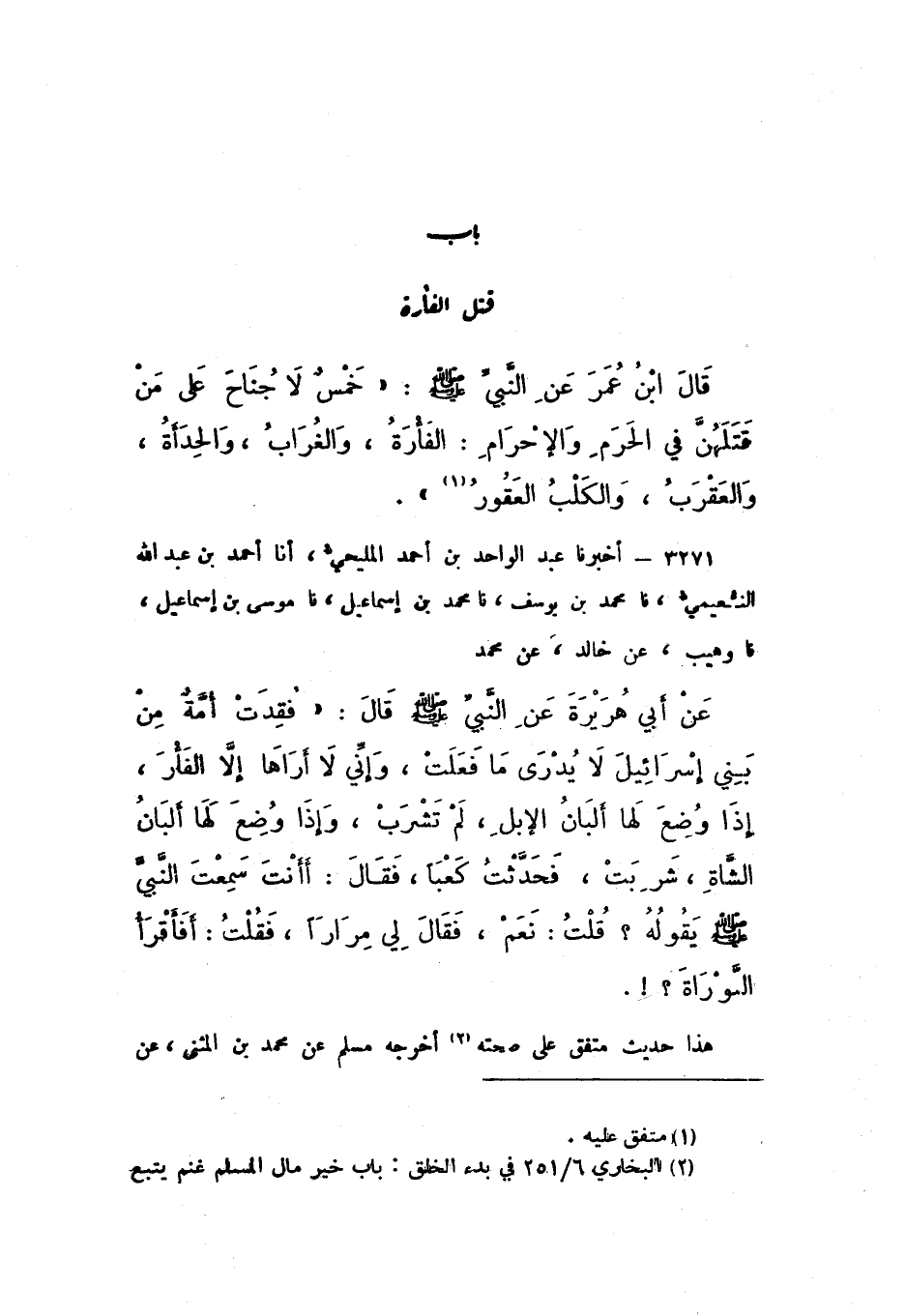 3271 - أَخْبَرَنَا عَبْدُ الْوَاحِدِ بْنُ أَحْمَدَ الْمَلِيحِيُّ، أَنا أَحْمَدُ بْنُ عَبْدِ اللَّهِ النُّعَيْمِيُّ، نَا مُحَمَّدُ بْنُ يُوسُفَ، نَا مُحَمَّدُ بْنُ إِسْمَاعِيلَ، نَا مُوسَى بْنُ إِسْمَاعِيلَ، نَا وُهَيْبٌ، عَنْ خَالِدٍ، عَنْ مُحَمَّدٍ، عَنْ أَبيِ هُرَيْرَةَ، عَنِ النَّبيِّ صَلَّى اللهُ عَلَيْهِ وَسَلَّمَ، قَالَ: «فَقدَتْ أُمَّةٌ مِنْ بَنِي إسْرَائِيلَ لَا يُدْرَى مَا فَعَلَتْ، وَإِنِّي لَا أَرَاهَا إِلا الْفَأْرَ، إِذا وُضِعَ لَهَا أَلْبَانُ الإِبِلِ، لَمْ تَشْرَبْ، وَإِذَا وُضِعَ لَهَا أَلْبَانُ الشَّاةِ، شَرِبَتْ»، فَحَدَّثْتُ كَعْبًا، فَقَالَ: أَأَنْتَ سَمِعْتَ النَّبِيَّ صَلَّى اللهُ عَلَيْهِ وَسَلَّمَ يَقُولُهُ؟ قُلْتُ: نَعَمْ، فَقَالَ لِي مِرَارًا، فَقُلْتُ: أَفَأَقْرَأُ التَّوْرَاةَ؟!.