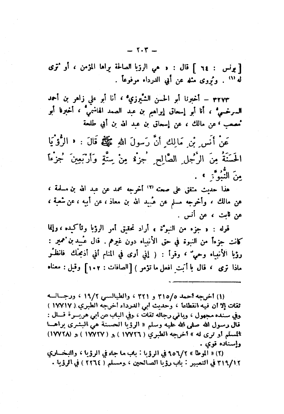 3273 - أَخْبَرَنَا أَبُو الْحَسَنِ الشِّيرَزِيُّ، أَنا أَبُو عَلِيٍّ زَاهِرُ بْنُ أَحْمَدَ السَّرَخْسِيُّ، أَنا أَبُو إِسْحَاقَ إِبْرَاهِيمُ بْنُ عَبْدِ الصَّمَدِ الْهَاشِمِيُّ، أَخْبَرَنَا أَبُو مُصْعَبٍ، عَنْ مَالِكٍ، عَنْ إِسْحَاقَ بْنِ عَبْدِ اللَّهِ بْنِ أَبِي طَلْحَةَ، عَنْ أَنَسِ بْنِ مَالِكٍ، أَنّ رَسُولَ اللَّهِ صَلَّى اللهُ عَلَيْهِ وَسَلَّمَ، قَالَ: «الرُّؤْيَا الْحَسَنَةُ مِنَ الرَّجُلِ الصَّالِحِ جُزْءٌ مِنْ سِتَّةٍ وَأَرْبَعِينَ جُزْءًا مِنَ النُّبُوَّةِ».