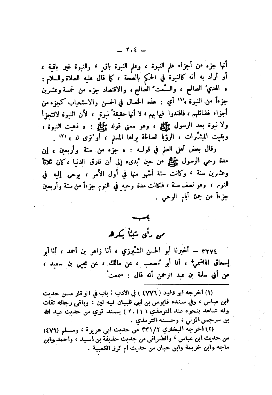 وَقَالَ بَعْضُ أَهْلِ الْعِلْمِ فِي قَوْلِهِ: «جُزْءٌ مِنْ سِتَّةِ وَأَرْبَعِينَ» إِنَّ مُدَّةَ وَحْيِ الرَّسُولِ صَلَّى اللهُ عَلَيْهِ وَسَلَّمَ مِنْ حِينِ بُدِئَ إِلَى أَنْ فَارَقَ الدُّنْيَا، كَانَ ثَلاثًا وَعِشْرِينَ سَنَةً، وَكَانَتْ سِتَّةُ أَشْهُرٍ مِنْهَا فِي أَوَّلِ الأَمْرِ، يُوحَى إِلَيْهِ فِي النَّوْمِ، وَهُوَ نِصْفُ سِنَةٍ، فَكَانَتْ مُدَّةُ وَحْيِهِ فِي النَّوْمِ جُزْءًا مِنْ سِتَّةٍ وَأَرْبَعِينَ جُزْءًا مِنْ جُمْلَةِ أَيَّامِ الْوَحْيِ.