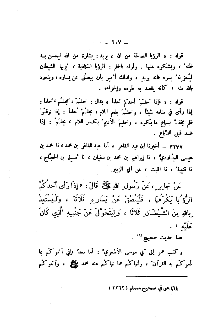 3277 - أَخْبَرَنَا ابْنُ عَبْدِ الْقَاهِرِ، أَنا عَبْدُ الْغَافِرِ بْنُ مُحَمَّدٍ، نَا مُحَمَّدُ بْنُ عِيسَى الْجُلُودِيُّ، نَا إِبْرَاهِيمُ بْنُ مُحَمَّدِ بْنِ سُفْيَانَ، نَا مُسلِمُ بْنُ الْحَجَّاجِ، نَا قُتَيْبَةُ، نَا اللَّيْثُ، عَنْ أَبِي الزُّبَيْرِ، عَنْ جَابِرٍ، عَنْ رَسُولِ اللَّهِ صَلَّى اللهُ عَلَيْهِ وَسَلَّمَ، قَالَ: «إِذَا رَأَى أَحَدُكُمُ الرُّؤْيَا يَكْرَهُهَا، فَلْيَبْصُقْ عَنْ يَسَارِهِ ثَلاثًا، وَلْيَسْتَعِذْ بِاللَّهِ مِنَ الشَّيْطَانِ ثَلاثًا، وَلْيَتَحَوَّلْ عَنْ جَنْبِهِ الَّذِي كَانَ عَلَيْهِ».