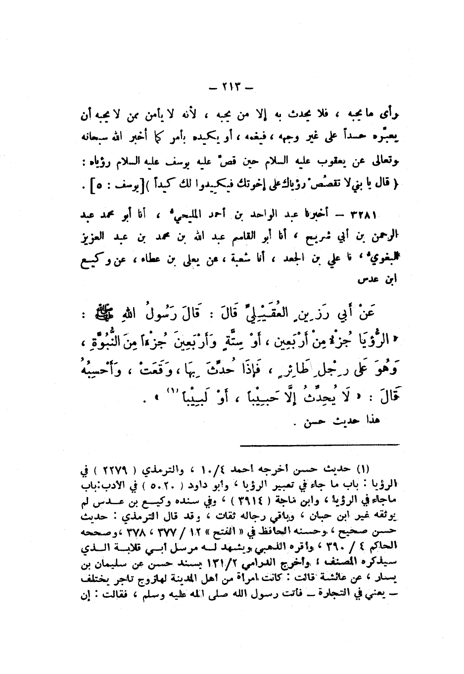 3281 - أَخْبَرَنَا عَبْدُ الْوَاحِدِ بْنُ أَحْمَدَ الْمَلِيحِيُّ، أَنا أَبُو مُحَمَّدٍ عَبْدُ الرَّحْمَنِ بْنُ أَبِي شُرَيْحٍ، أَنا أَبُو الْقَاسِمِ عَبْدُ اللَّهِ بْنُ مُحَمَّدِ بْنِ عَبْدِ الْعَزِيزِ الْبَغَوِيُّ، نَا عَلِيُّ بْنُ الْجَعْدِ، أَنا شُعْبَةُ، عَنْ يَعْلَى بْنِ عَطَاءٍ، عَنْ وَكِيعِ بْنِ عَدَسٍ، عَنْ أَبي رَزِينٍ الْعُقَيْلِيِّ، قَالَ: قَالَ رَسُولُ اللَّهِ صَلَّى اللهُ عَلَيْهِ وَسَلَّمَ: «الرُّؤْيَا جُزْءٌ مِنْ أَرْبَعِينَ، أَوْ سِتَّةٍ وَأَرْبَعِينَ جُزْءًا مِنَ النُّبُوَّةِ، وَهُوَ عَلَى رِجْلِ طَائِرٍ، فَإِذَا حُدِّثَ بِهَا، وَقَعَتْ»، وَأَحْسَبُهُ قَالَ: «لَا يُحَدِّثُ إِلا حَبِيبًا، أَوْ لَبِيبًا».