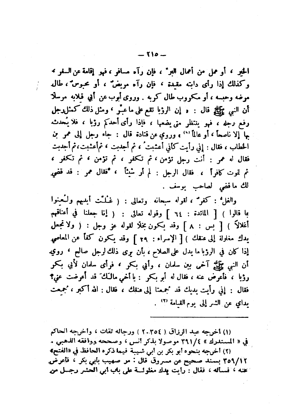 الْخَيْرِ، أَوْ عَمَلٍ مِنْ أَعْمَالِ الْبِرِّ، فَإِنْ رَآهُ مُسَافِرٌ، فَهُوَ إِقَامَةٌ عَنِ السَّفَرِ، وَكَذَلِكَ إِذَا رَأَى دَابَّتَهُ مُقَيَّدَةً، فَإِنْ رَآهُ مَرِيضٌ، أَوْ مَحْبُوسٌ، طَالَ مَرَضُهُ وَحَبْسُهُ، أَوْ مَكْرُوبٌ طَالَ كَرْبُهُ.