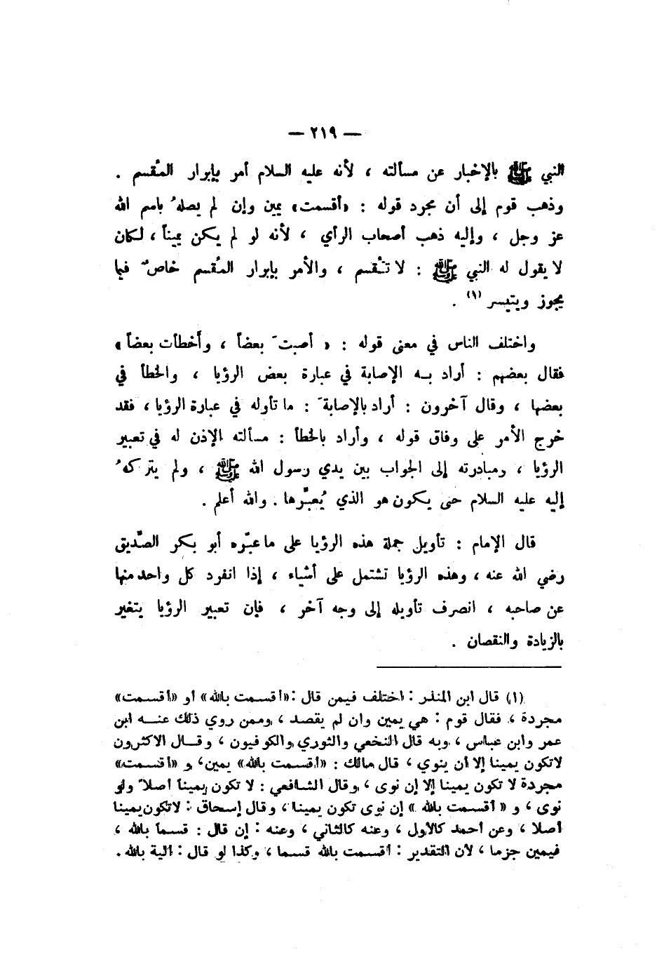 وَقَالَ آخَرُونَ: أَرَادَ بِالإِصَابَةِ: مَا تَأَوَّلَهُ فِي عِبَارَةِ الرُّؤْيَا، فَقَدْ خَرَجَ الأَمْرُ عَلَى وِفَاقِ قَوْلِهِ، وَأَرَادَ بِالْخَطَأِ: مَسْأَلَتُهُ الإِذْنَ لَهُ فِي تَعْبِيرِ الرُّؤْيَا، وَمُبَادَرَتِهِ إِلَى الْجَوَابِ بَيْنَ يَدَيْ رَسُولِ اللَّهِ صَلَّى اللهُ عَلَيْهِ وَسَلَّمَ، وَلَمْ يَتْرُكْهُ إِلَيْهِ عَلَيْهِ السَّلامُ حَتَّى يَكُونَ هُوَ الَّذِي يُعَبِّرُهَا، وَاللَّهُ أَعْلَمُ.