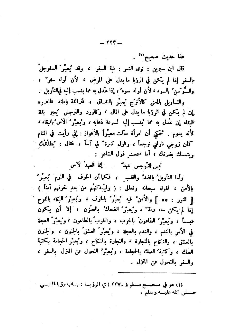 قَالَ ابْنُ سِيرِينَ: نَوَى التَّمْرِ: نِيَّةُ السَّفَرِ، وَقَدْ يُعَبَّرُ السَّفَرْجَلُ بِالسَّفَرِ إِذَا لَمْ يَكُنْ فِي الرُّؤْيَا مَا يَدُلُّ عَلَى الْمَرَضِ، لأَنَّ أَوَّلَهُ سَفَرٌ.