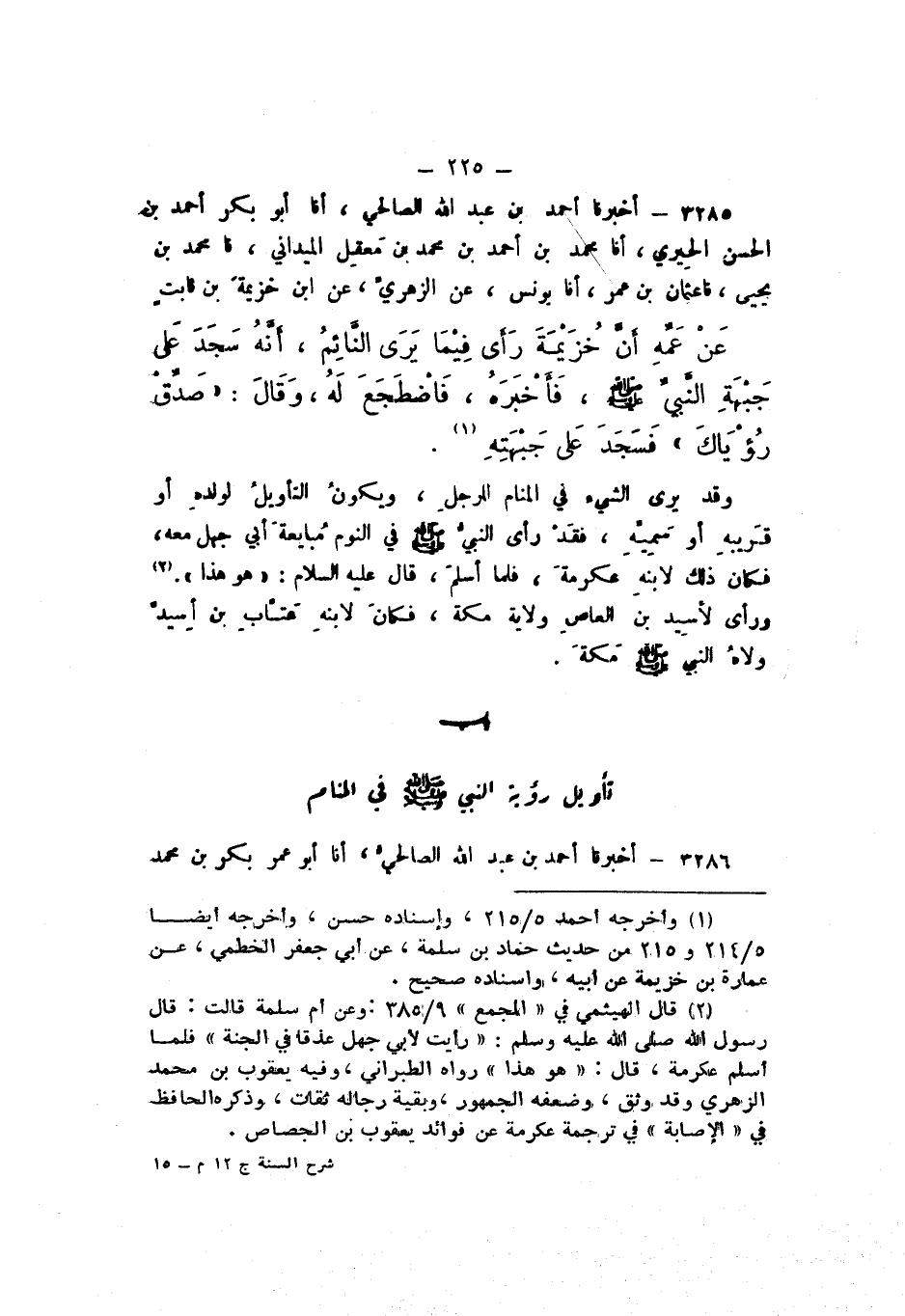 3285 - أَخْبَرَنَا أَحْمَدُ بْنُ عَبْدِ اللَّهِ الصَّالِحِيُّ، أَنا أَبُو بَكْرٍ أَحْمَدُ بْنُ الْحَسَنِ الْحِيرِيُّ، أَنا مُحَمَّدُ بْنُ أَحْمَدَ بْنِ مُحَمَّدِ بْنِ مَعْقِلٍ الْمَيْدَانِيُّ، نَا مُحَمَّدُ بْنُ يَحْيَى، نَا عُثْمَانُ بْنُ عُمَرَ، أَنا يُونُسُ، عَنِ الزُّهْرِيِّ، عَنِ ابْنِ خُزَيْمَةَ بْنِ ثَابِتٍ، عَنْ عَمِّهِ، " أَنَّ خُزَيْمَةَ رَأَى فِيمَا يَرَى النَّائِمُ، أنَّهُ سَجَدَ عَلى جَبْهَةِ النَّبِيَّ صَلَّى اللهُ عَلَيْهِ وَسَلَّمَ، فَأَخْبَرَهُ، فَاضْطَجَعَ لَهُ، وَقَالَ: صَدِّقْ رُؤْيَاكَ ".