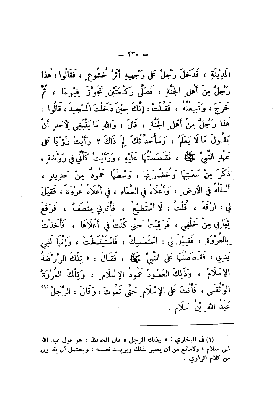 فَأَتَانِي مِنْصَفٌ، فَرَفَعَ ثِيَابِي مِنْ خَلْفِي، فَرَقِيتُ حَتَّى كُنْتُ فِي أَعْلاهَا، فَأَخَذْتُ بِالْعُرْوَةِ، فَقِيلَ لِي: اسْتَمْسِكْ، فَاسْتَيْقَظْتُ، وَإِنَّهَا لَفِي يَدِي، فَقَصَصْتُهَا عَلَى النَّبيِّ صَلَّى اللهُ عَلَيْهِ وَسَلَّمَ، فَقَالَ: تِلْكَ الرَّوْضَةُ الإِسْلامُ، وَذَلِكَ الْعَمُودُ عَمُودُ الإِسْلامِ، وَتِلْكَ الْعُرْوَةُ الْوُثْقَى، فَأَنْتَ عَلَى الإِسْلامِ حَتَّى تَمُوتَ، وَقَالَ: الرَّجُلُ عَبْدُ اللَّهِ بْنُ سَلامٍ ".