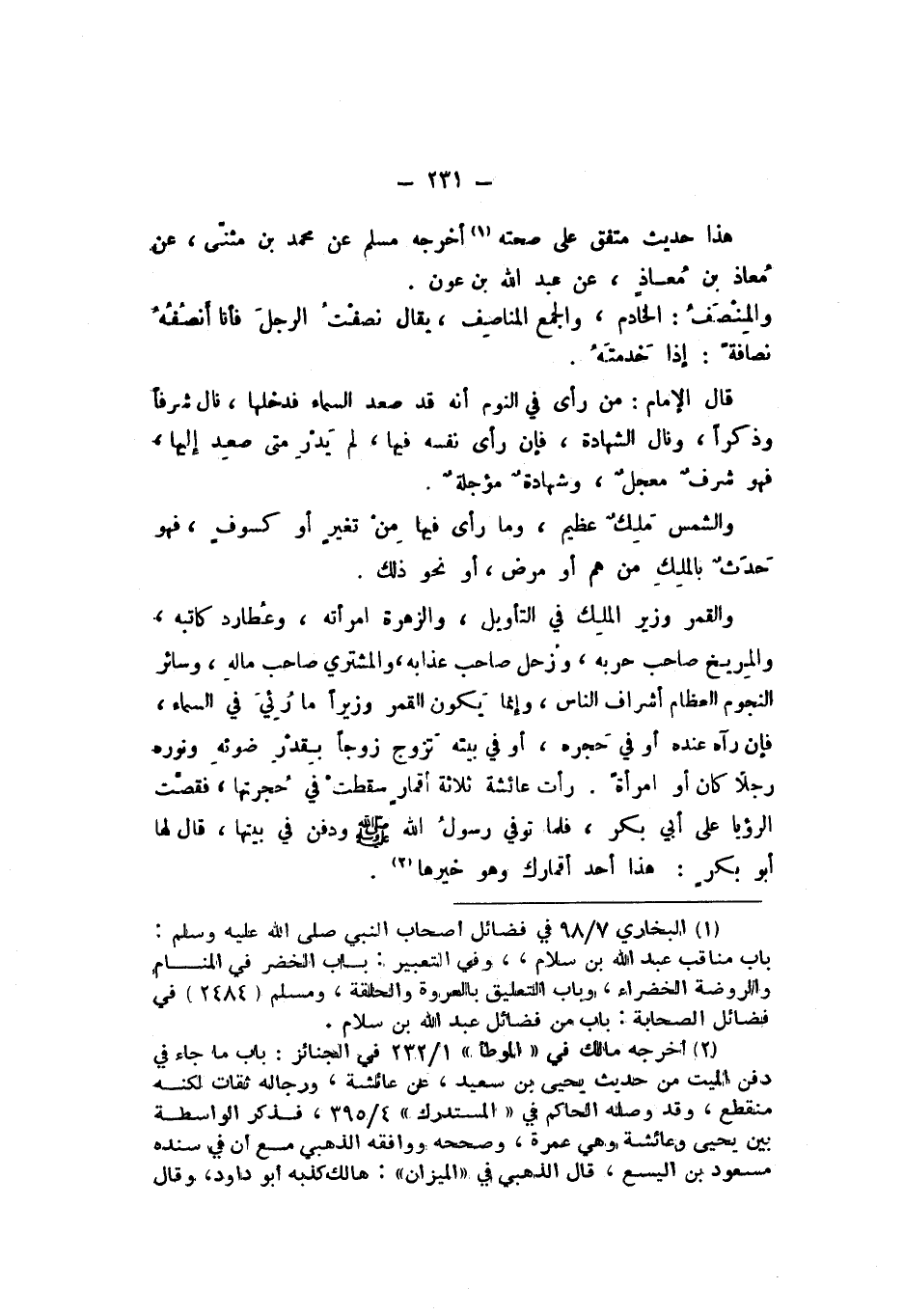 قَالَ الإِمَامُ: مِنْ رَأَى فِي النَّوْمِ أَنَّهُ قَدْ صَعِدَ السَّمَاءَ فَدَخَلَهَا، نَالَ شَرَفًا وَذِكْرًا، وَنَالَ الشَّهَادَةَ، فَإِنْ رَأَى نَفْسَهُ فِيهَا، لَمْ يَدْرِ مَتَى صَعِدَ إِلَيْهَا، فَهُوَ شَرَفٌ مُعَجَّلٌ، وَشَهَادَةٌ مُؤَجَّلَةٌ.