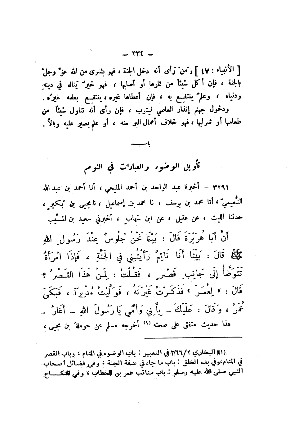3291 - أَخْبَرَنَا عَبْدُ الْوَاحِدِ بْنُ أَحْمَدَ الْمَلِيحِيُّ، أَنا أَحْمَدُ بْنُ عَبْدِ اللَّهِ النُّعَيْمِيّ، أَنا مُحَمَّدُ بْنُ يُوسُفَ، نَا مُحَمَّدُ بْنُ إِسْمَاعِيلَ، نَا يَحْيَى بْنُ بُكَيْرٍ، حَدَّثَنَا اللَّيْثُ، عَنْ عُقَيْلٍ، عَنِ ابْنِ شِهَابٍ، أَخْبَرَنِي سَعِيدُ بْنُ الْمُسَيِّبِ، أَنَّ أَبَا هُرَيْرَةَ، قَالَ: بَيْنَما نَحْنُ جُلُوسٌ عِنْدَ رَسُولِ اللَّهِ صَلَّى اللهُ عَلَيْهِ وَسَلَّمَ، قَالَ: " بَيْنَا أَنَا نَائِمٌ رَأَيْتُنِي فِي الْجَنَّةِ، فَإذَا امْرَأَةٌ تَتَوَضَّأُ إِلَى جَانِبِ قَصْرٍ، فَقُلْتُ: لَمِنْ هَذَا القَصْرُ؟ قَالَ: لِعُمَرَ.