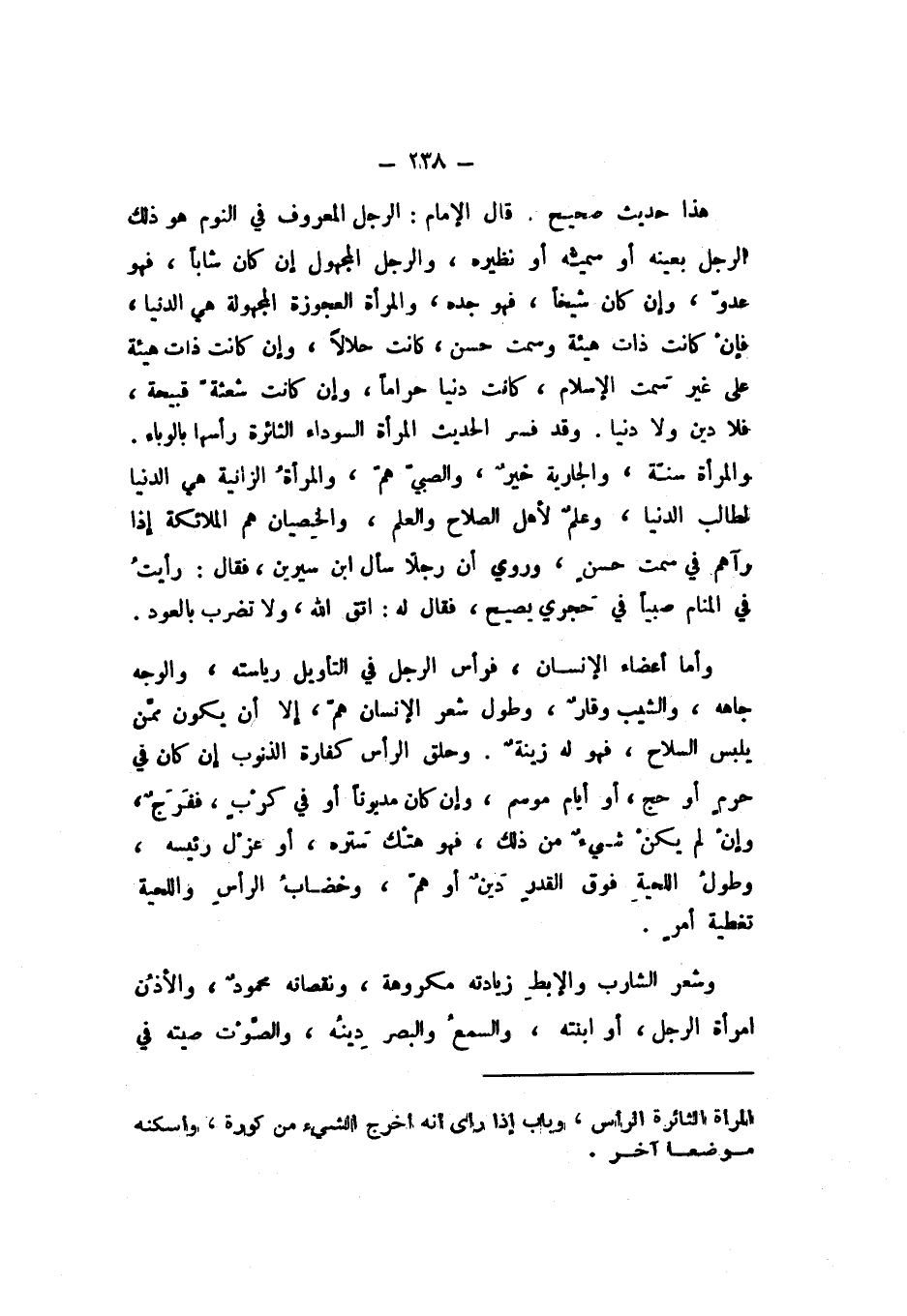 قَالَ الإِمَامُ: الرَّجُلُ الْمَعْرُوفُ فِي النَّوْمِ هُوَ ذَلِكَ الرَّجُلُ بِعَيْنِهِ أَوْ سَمِيُّهُ أَوْ نَظِيرُهُ، وَالرَّجُلُ الْمَجْهُولُ إِنْ كَانَ شَابًّا، فَهُوَ عَدُوٌّ، وَإِنْ كَانَ شَيْخًا، فَهُوَ جَدُّهُ، وَالْمَرْأَةُ الْعَجُوزُ الْمَجْهُولَةُ هِيَ الدُّنْيَا، فَإِنْ كَانَتْ ذَاتَ هَيْئَةٍ وَسَمْتٍ حَسَنٍ، كَانَتْ حَلالا، وَإِنْ كَانَتْ ذَاتَ هَيْئَةٍ عَلَى غَيْرِ سَمْتِ الإِسْلامِ، كَانَتْ دُنْيَا حَرَامًا، وَإِنْ كَانَتْ شَعَثَةً قَبِيحَةً، فَلا دِينَ وَلا دُنْيَا.