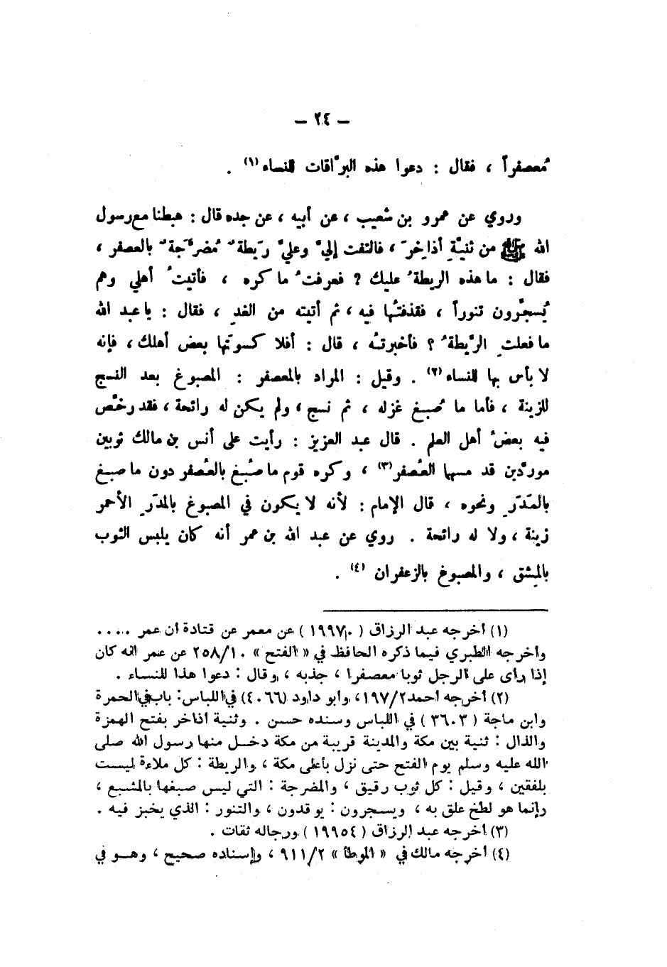 وَرُوِيَ عَنْ عَمْرِو بْنِ شُعَيْبٍ، عَنْ أَبِيهِ، عَنْ جَدِّهِ، قَالَ: هَبَطْنَا مَعَ رَسُولِ اللَّهِ صَلَّى اللهُ عَلَيْهِ وَسَلَّمَ مِنْ ثَنِيَّةِ أَذَاخِرَ، فَالْتَفَتَ إِلَيَّ وَعَلَيَّ رَيْطَةٌ مُضَرَّجَةٌ بِالْعُصْفُرِ، فَقَالَ: " مَا هَذِهِ الرَّيْطَةُ عَلَيْكَ؟ فَعَرَفْتُ مَا كَرِهَ، فَأَتَيْتُ أَهْلِي وَهُمْ يَسْجُرُونَ تَنُّورًا، فَقَذَفْتُهَا فِيهِ، ثُمَّ أَتَيْتُهُ مِنَ الْغَدِ، فَقَالَ: يَا عَبْدَ اللَّهِ مَا فَعَلَتِ الرَّيْطَةُ؟ فَأَخْبَرْتُهُ، قَالَ: أَفَلا كَسَوْتَهَا بَعْضَ أَهْلِكَ، فَإِنَّهُ لَا بَأْسَ بِهَا لِلنِّسَاءِ ".