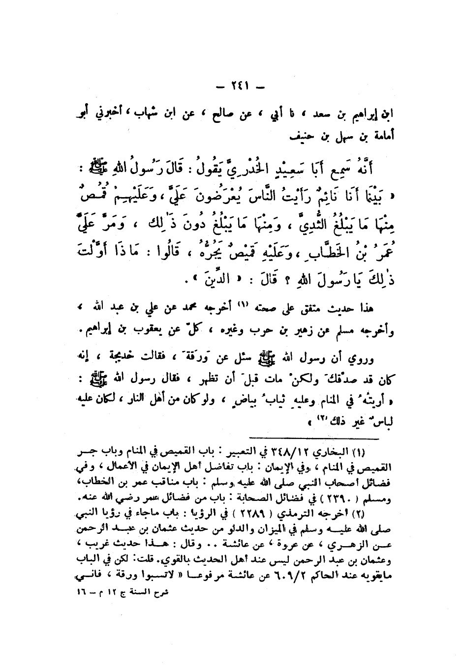 بْنُ إِبْرَاهِيمَ بْنِ سَعْدٍ، نَا أَبِي، عَنْ صَالِحٍ، عَنِ ابْنِ شِهَابٍ، أَخْبَرَنِي أَبُو أُمَامَةَ بْنُ سَهْلِ بْنِ حُنَيْفٍ، أَنَّهُ سَمِعَ أَبَا سَعِيدٍ الْخُدْرِيَّ، يَقُولُ: قَالَ رَسُولُ اللَّهِ صَلَّى اللهُ عَلَيْهِ وَسَلَّمَ: " بَيْنَما أَنَا نَائَمُ رَأَيْتُ النًّاسَ يُعْرِضُونَ عَلَيَّ، وَعَلَيْهِم قُمُصٌ، مِنْهَا مَا يَبْلُغُ الثُّدِيَّ، وَمِنْهَا مَا يَبْلُغُ دُونَ ذَلِكَ، وَمَرَّ عَلَيَّ عُمَرُ بْنُ الْخَطَّابِ، وَعَلَيْهِ قَمِيصٌ يَجُرُّهُ، قَالُوا: مَاذَا أَوَّلْتَ ذَلِكَ يَا رَسُولَ اللَّهِ؟ قَالَ: الدِّينَ ".